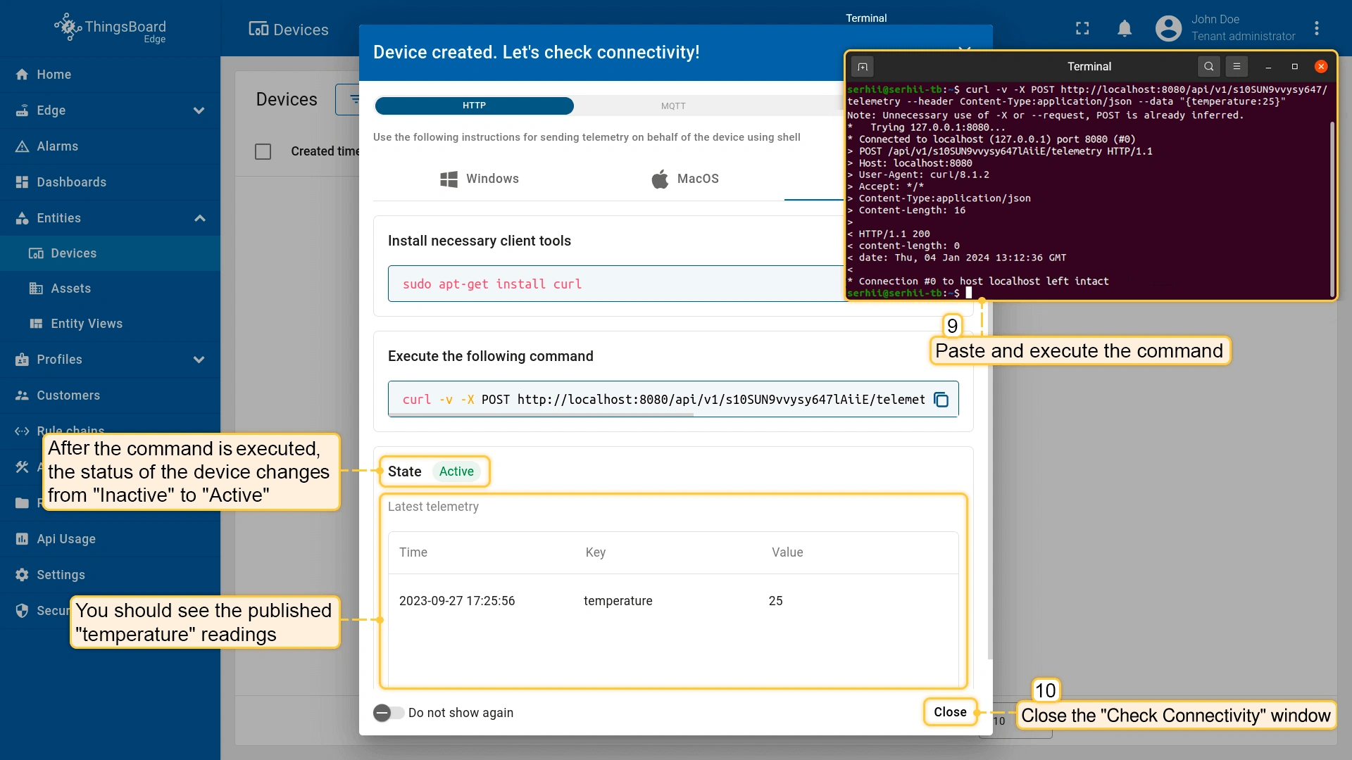 - Run the previously copied command. Once the "temperature" readings are published, the device state will change from "Inactive" to "Active", and you will see the published "temperature" readings. Finally, close the connectivity window.