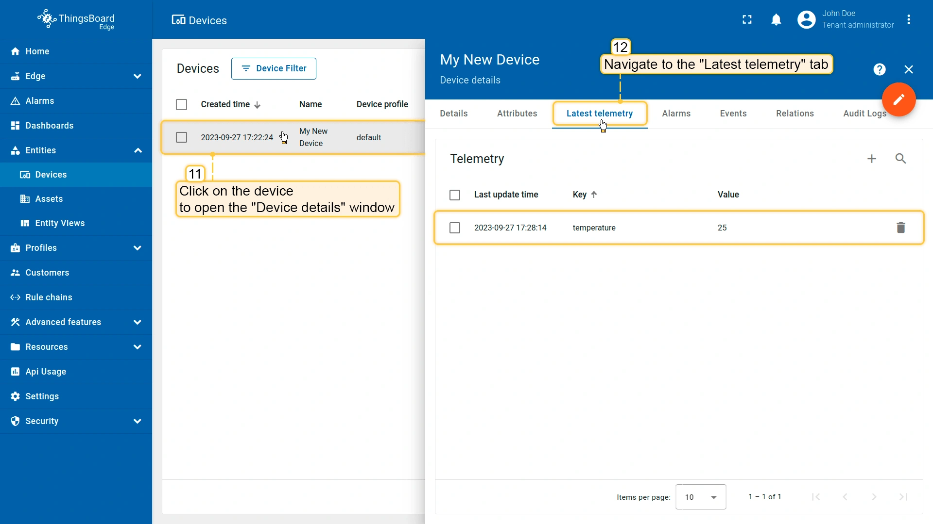 - To verify the received telemetry, click on the device entity and open the "Latest Telemetry" tab.