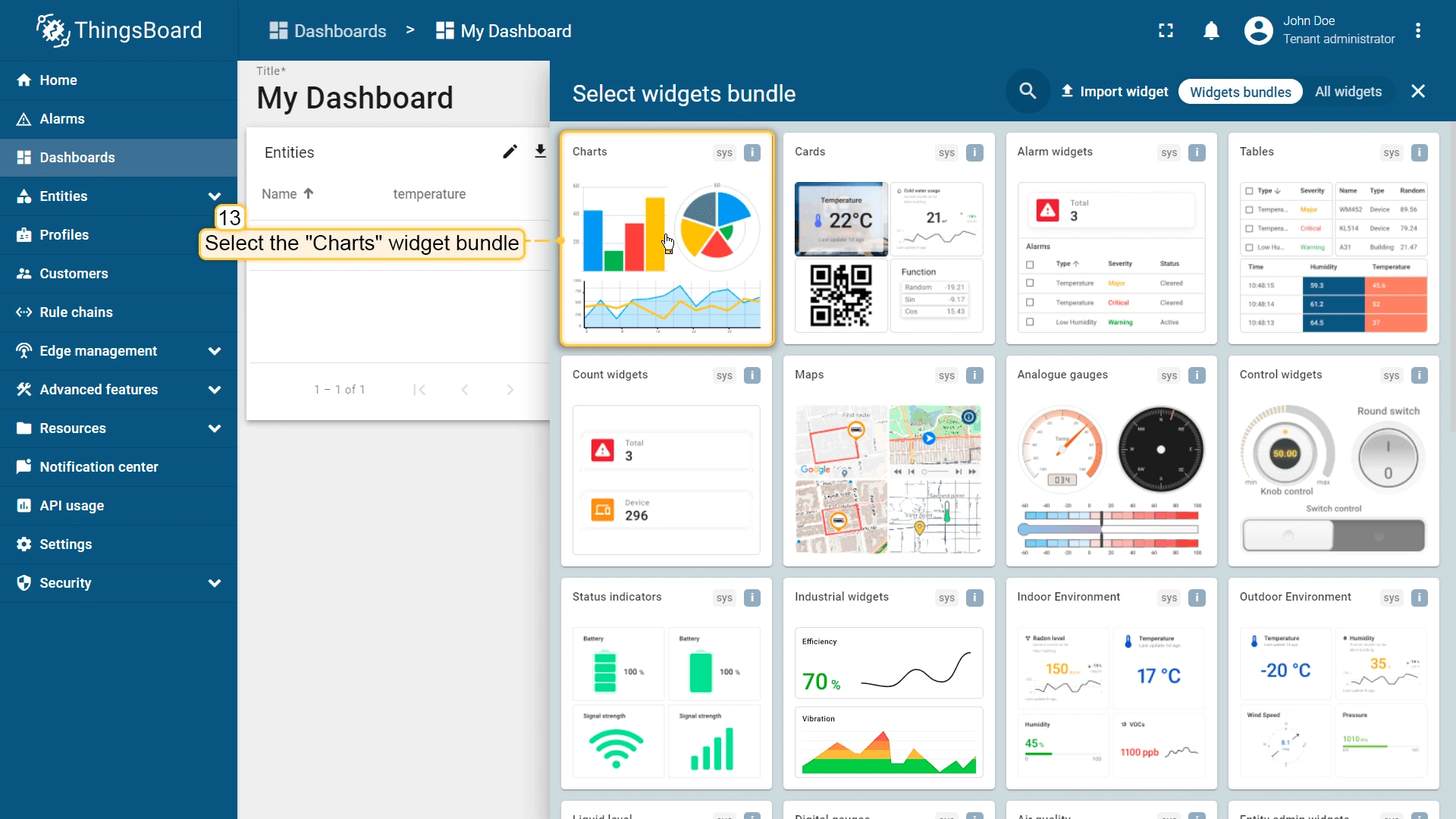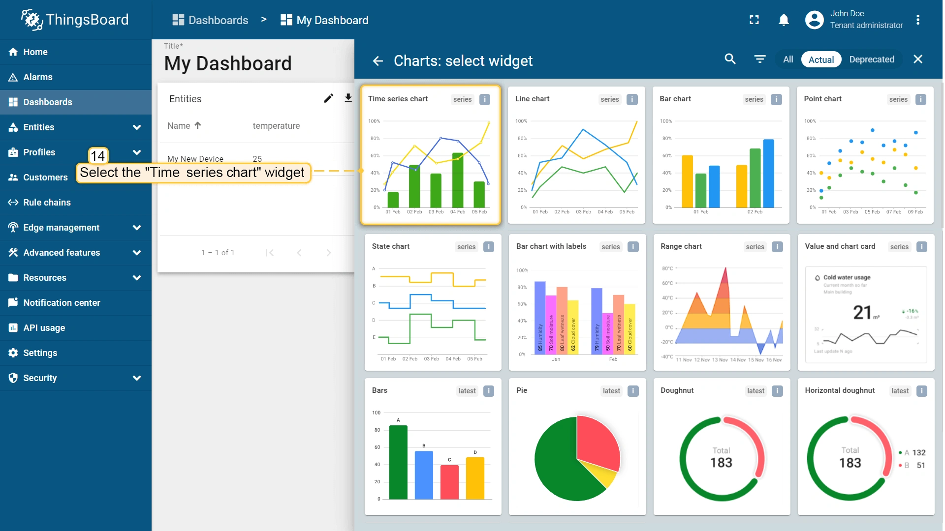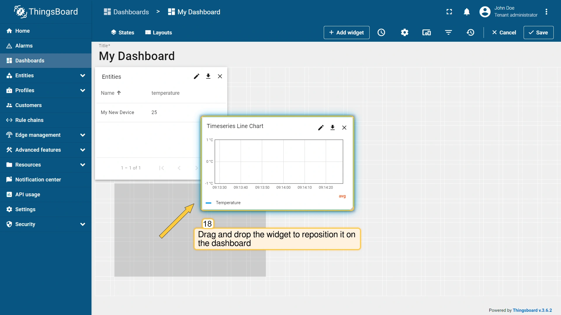 例如,我们来添加并配置 Entities table 和 Time series chart 部件: