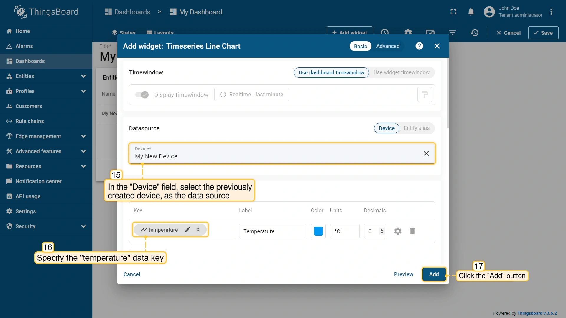 - Select the previously created device, "My New Device", as the data source, and click the "Add" button. The "Time series chart" widget has been successfully added to the dashboard.