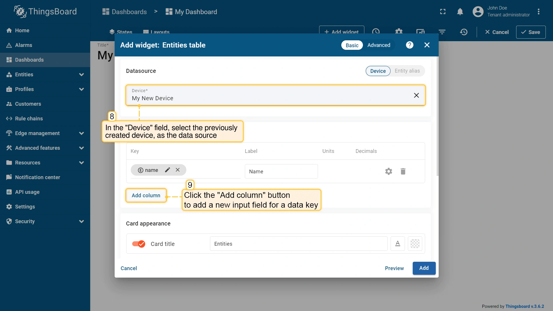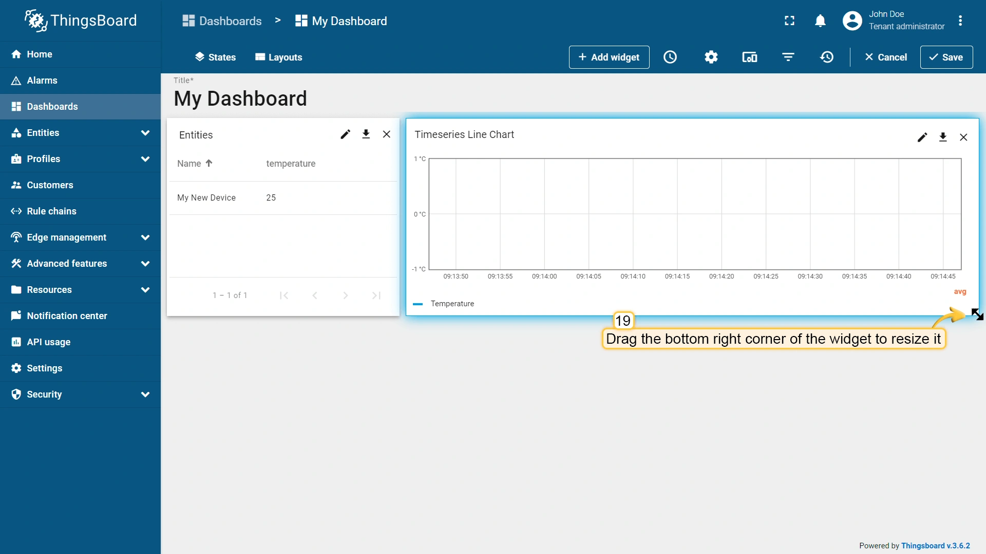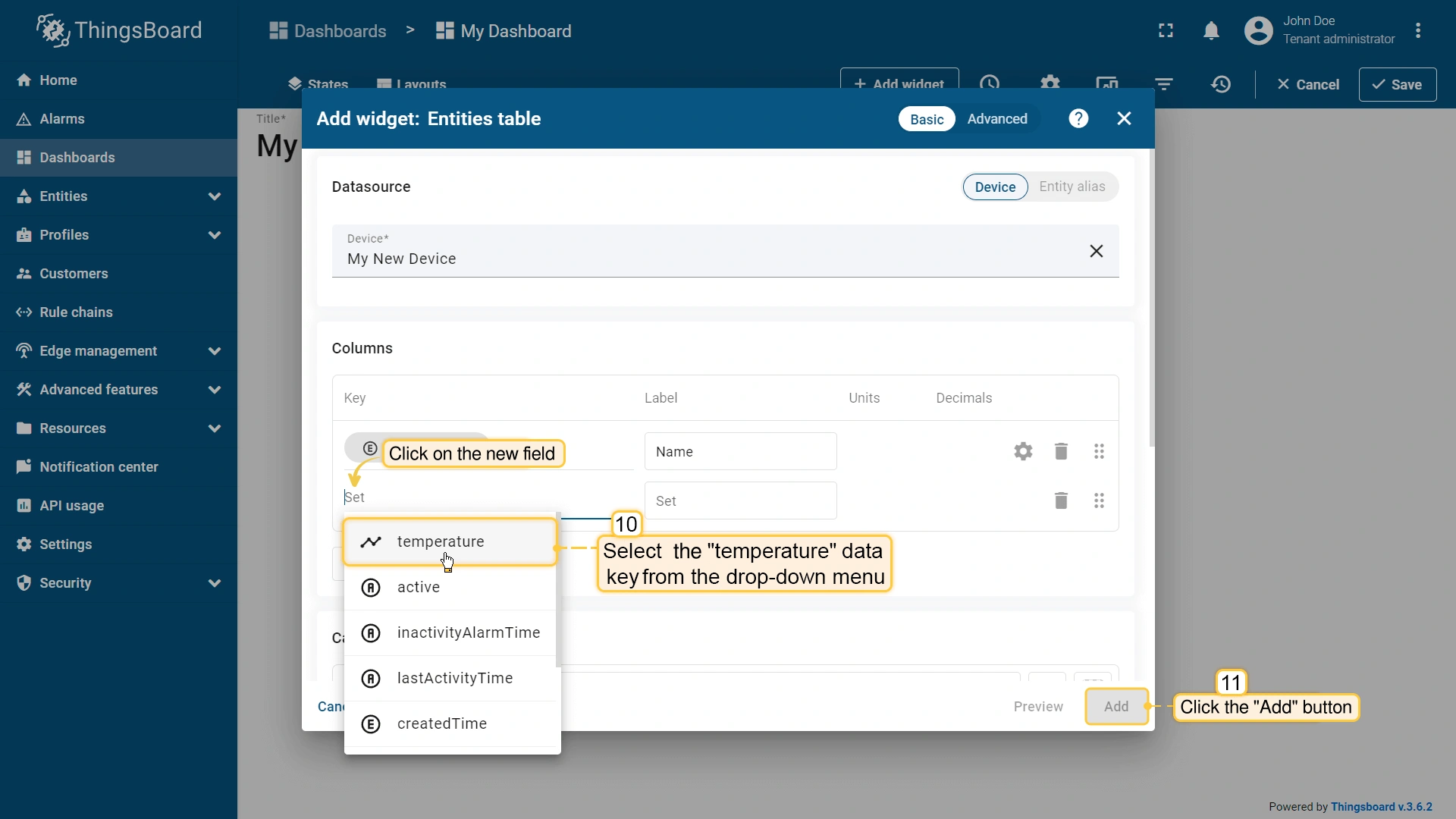 - The "Entities table" widget has been added, and "My New Device" is now displayed in the list. To add another widget, click the "Add widget" button.