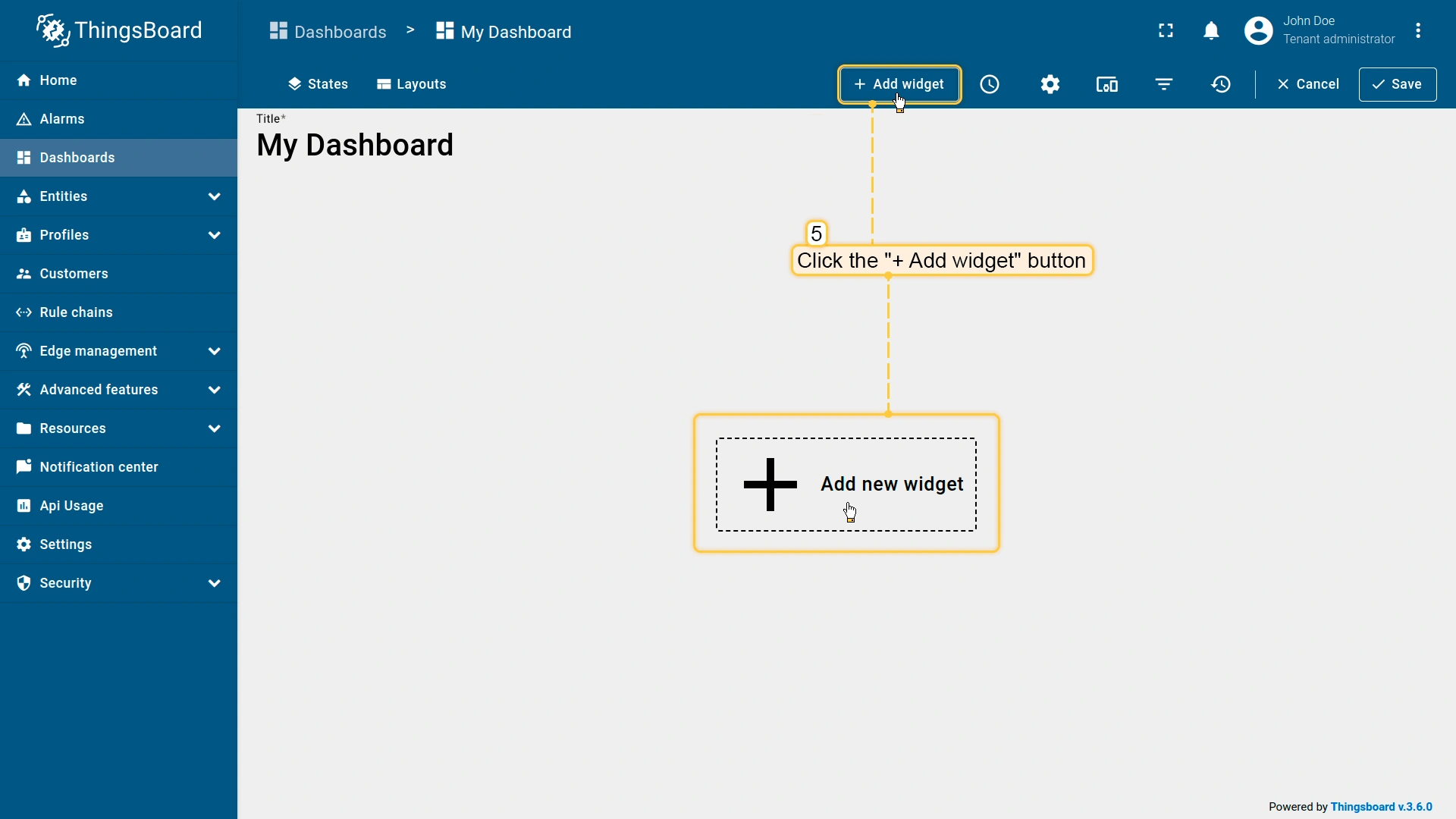 要创建仪表盘,请登录您的 ThingsBoard Edge 实例并进入 Dashboard 部分,然后按以下步骤操作: