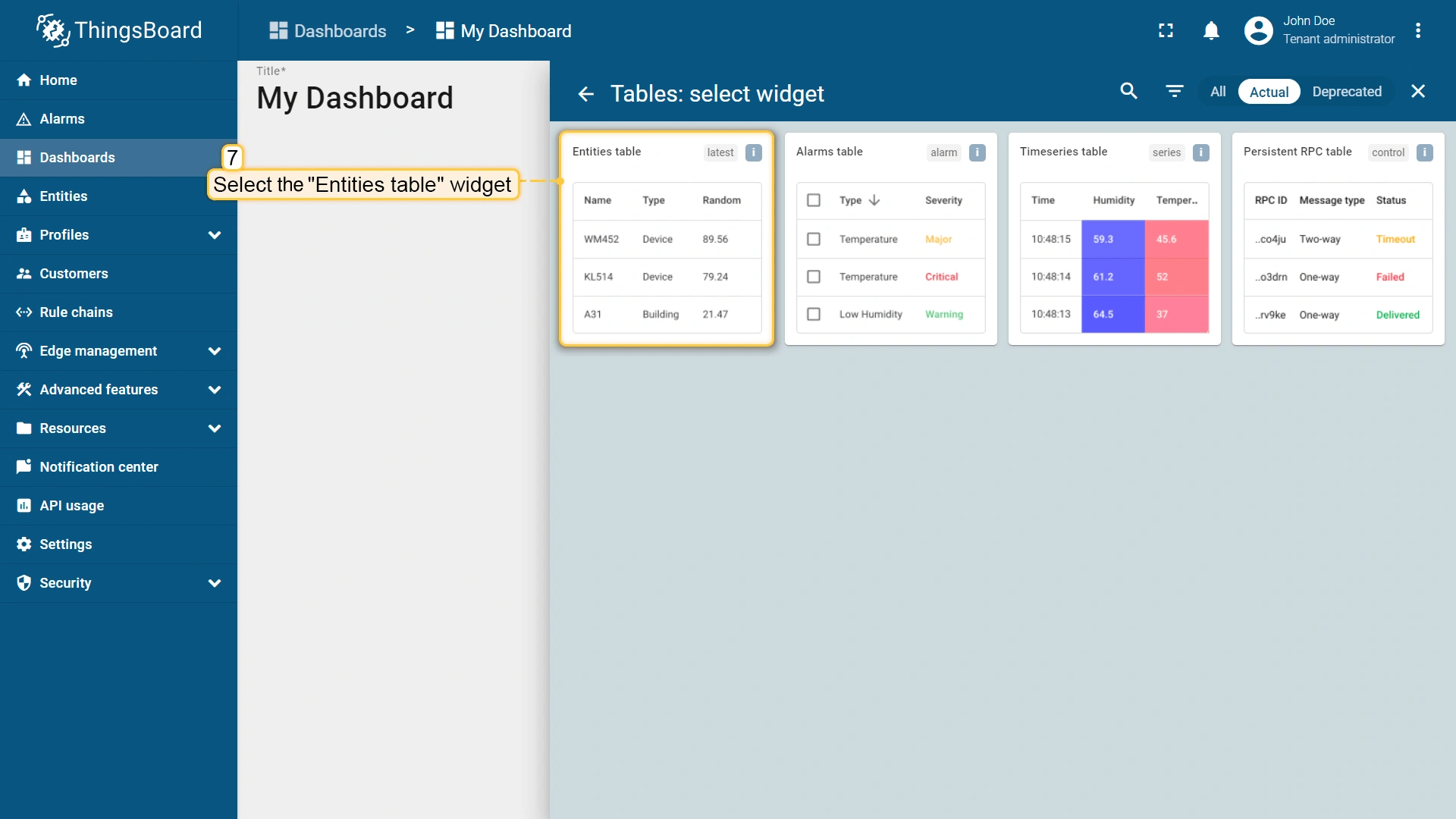 - Select the "Entities table" widget.
