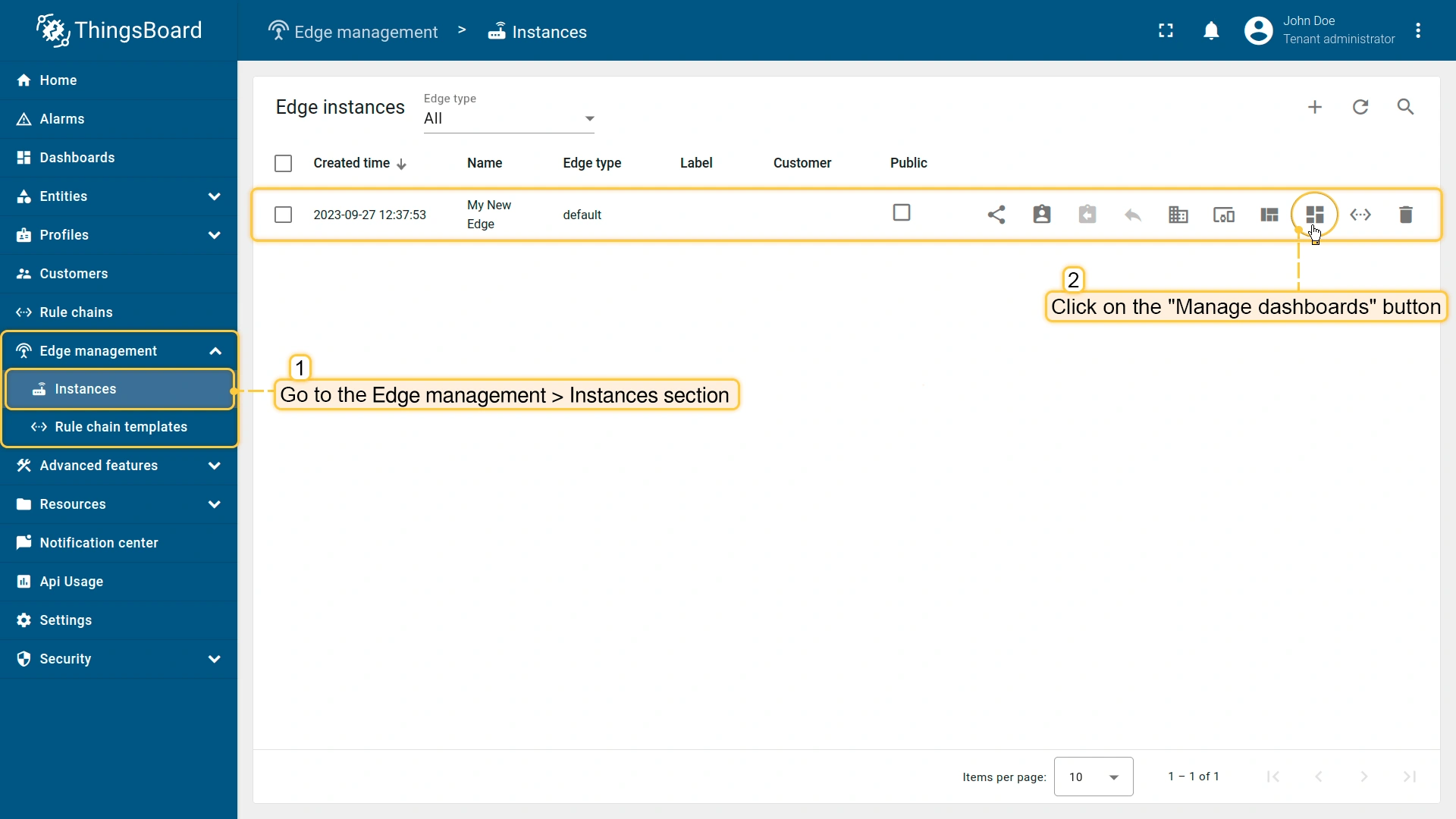 - Then, navigate to the Edge management > Instances section and click on the "Manage dashboards" button of the instance in question.