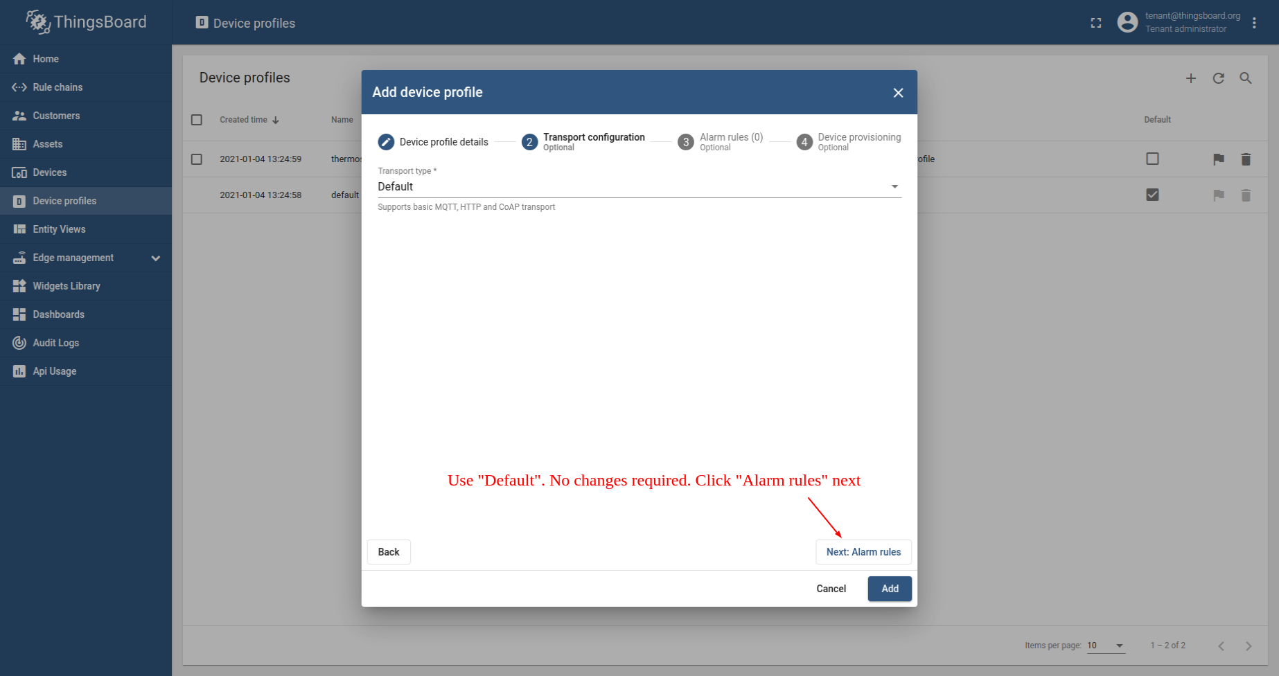 - Login to your ThingsBoard Edge instance and open Device profiles page.