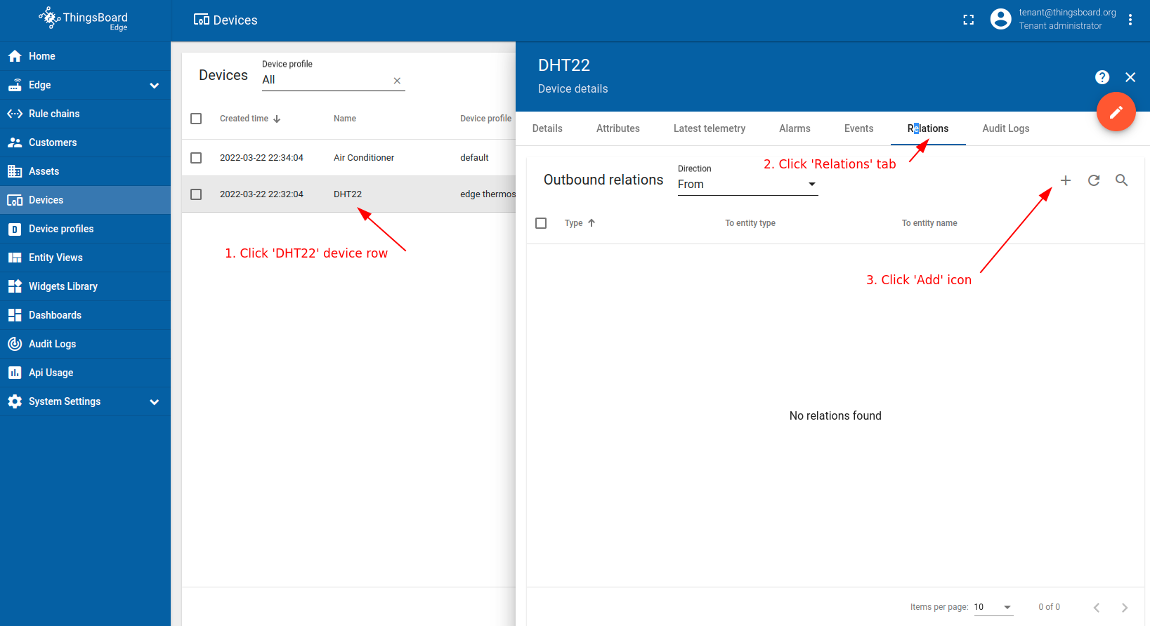 - Click on "DHT22" device row to open device details and navigate to "Relations" tab. Click "+" icon to add new relation.