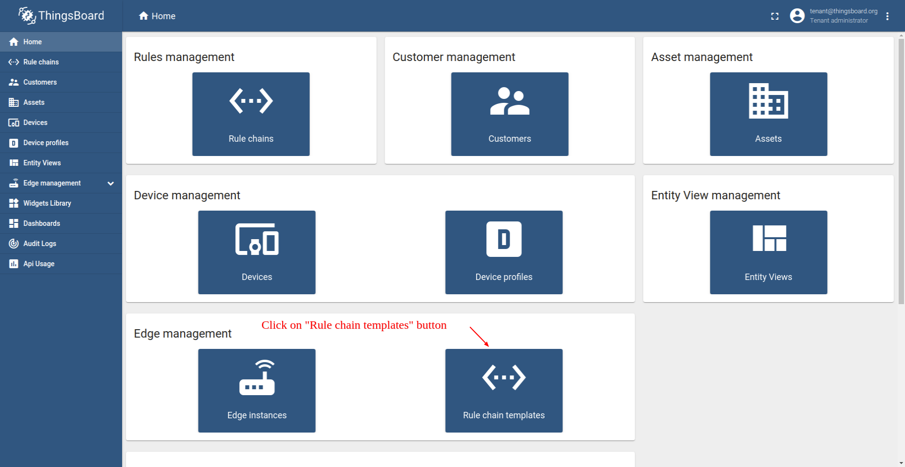 - Login to your ThingsBoard instance and open Rule chain templates page.