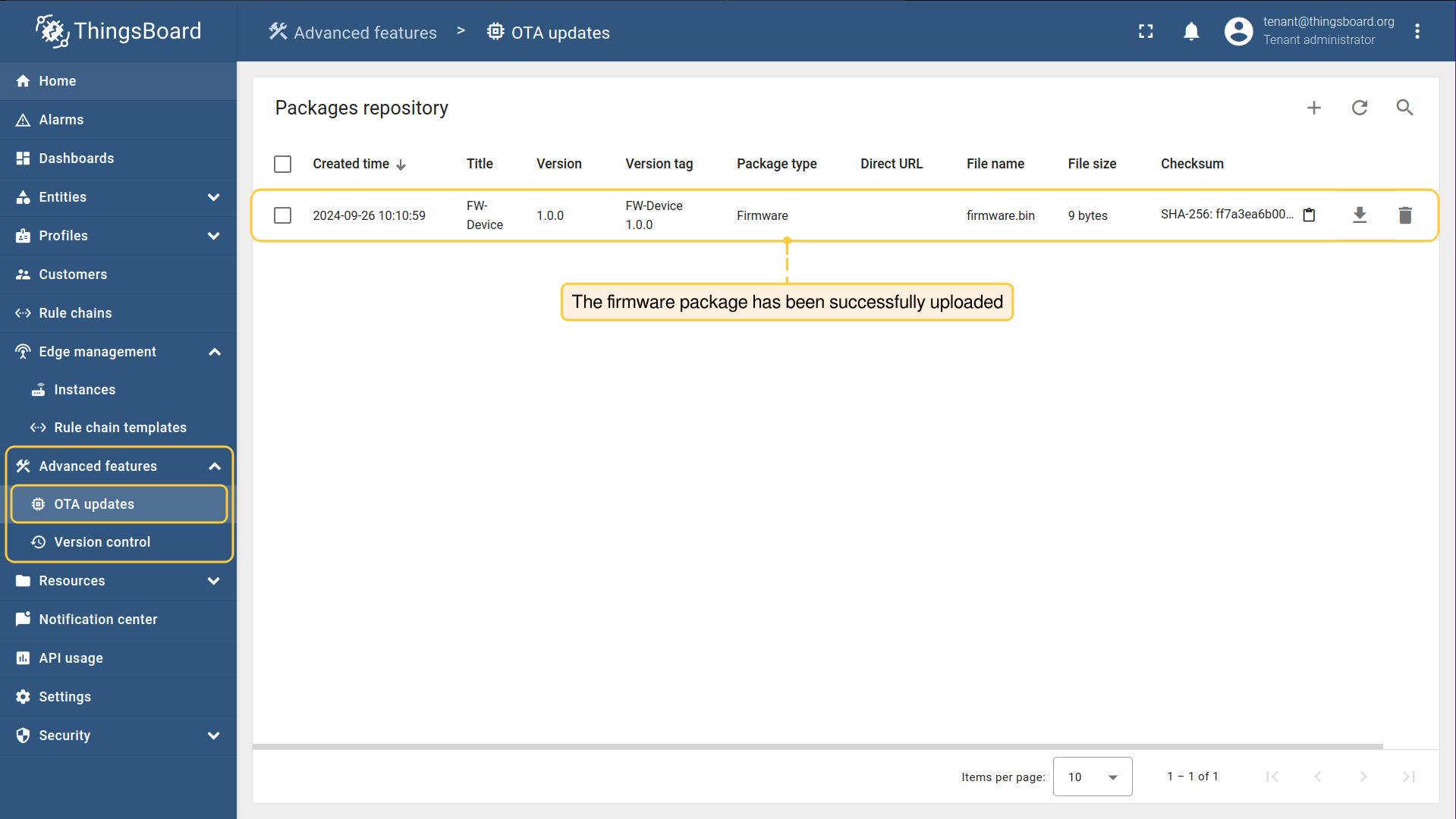 使用您的凭据登录ThingsBoard Edge实例,并进入Advanced features > OTA updates区域。以确认固件包已在Edge实例上成功配置。