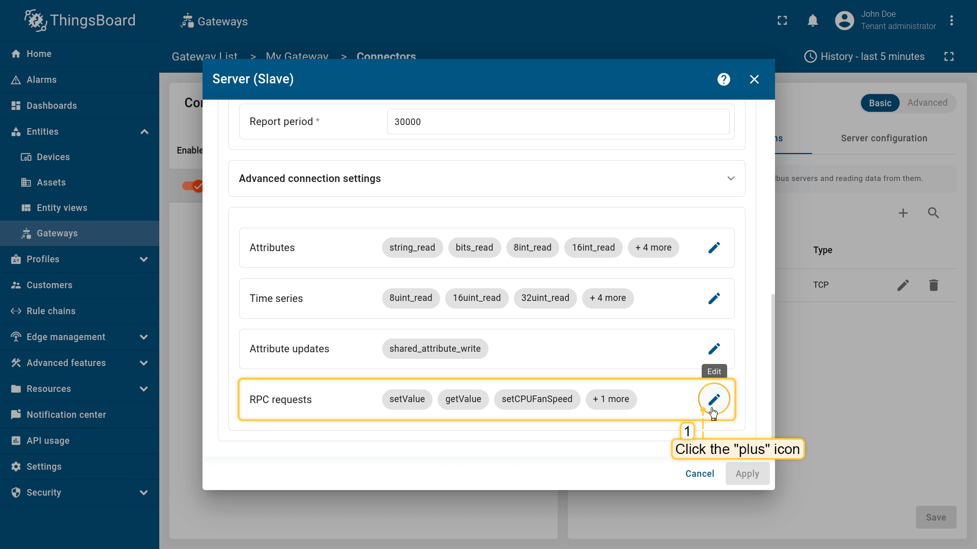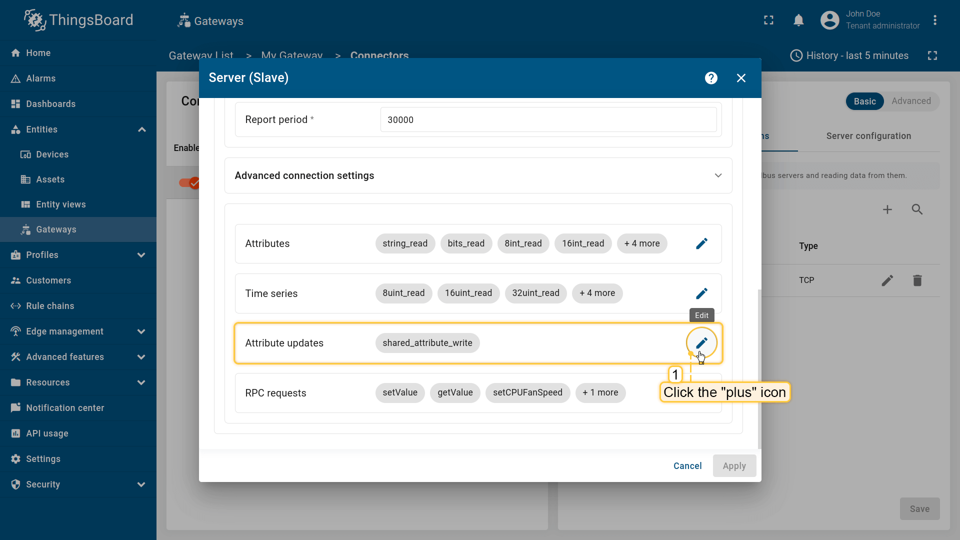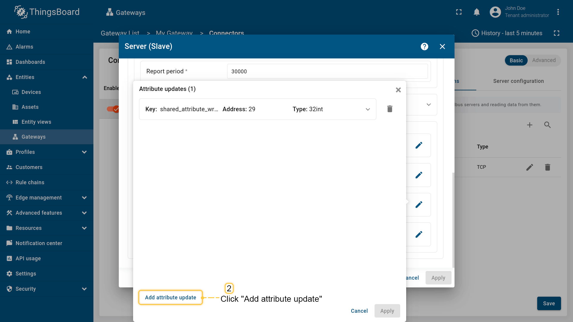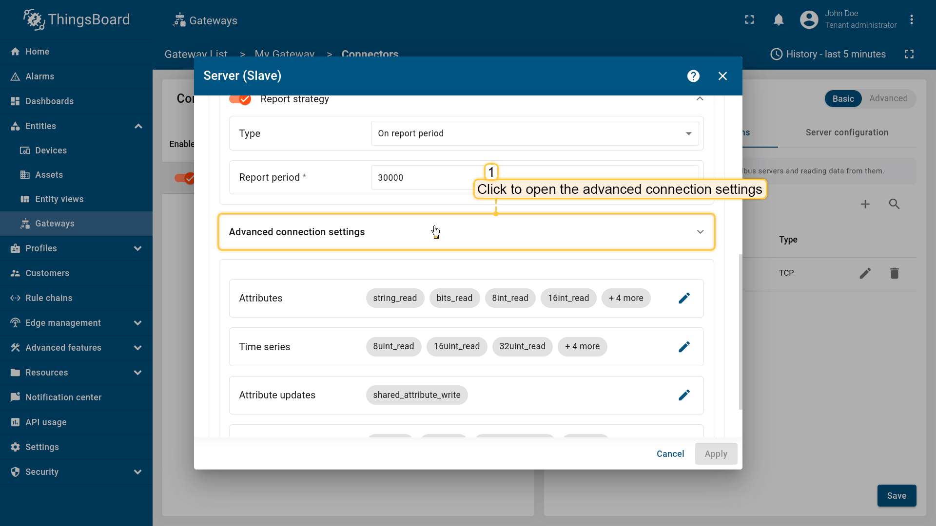 - On value change or report period - 当值变化或在上报周期后向 ThingsBoard 发送数据;