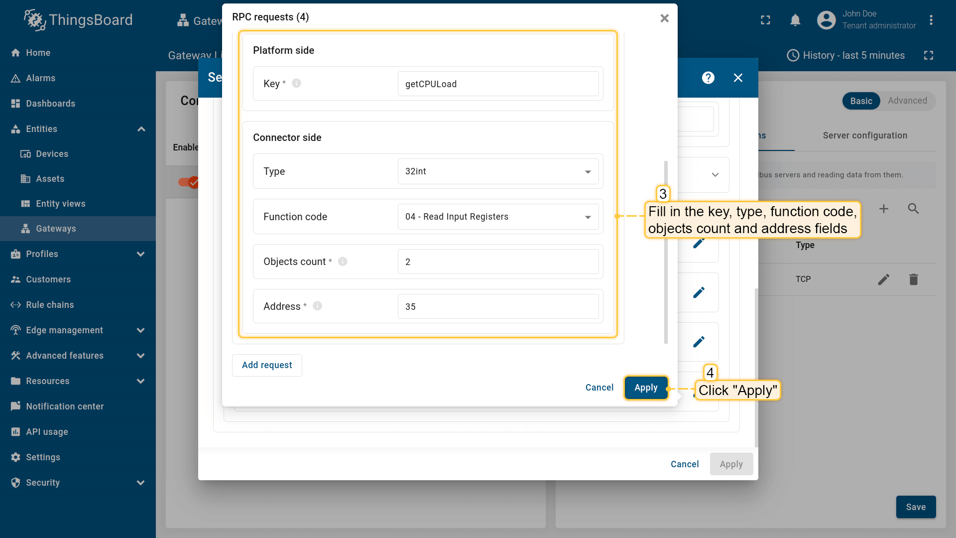 填写 key、type、function code、objects count 和 address 字段。点击 “Apply”。