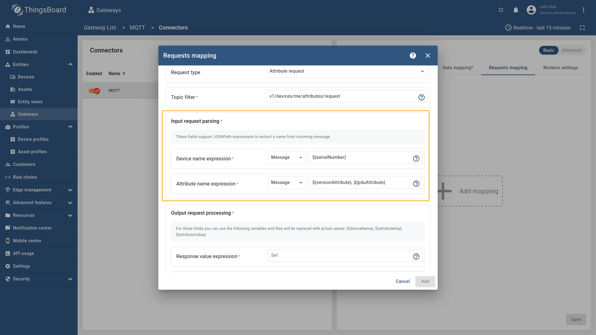 设备名和配置文件可从入站消息中提取。本示例使用 json path 指定设备名和配置文件。 以下示例使用 ThingsBoard MQTT 演示代理,可通过 Docker 及以下命令运行: 代理运行于 我们还希望从
