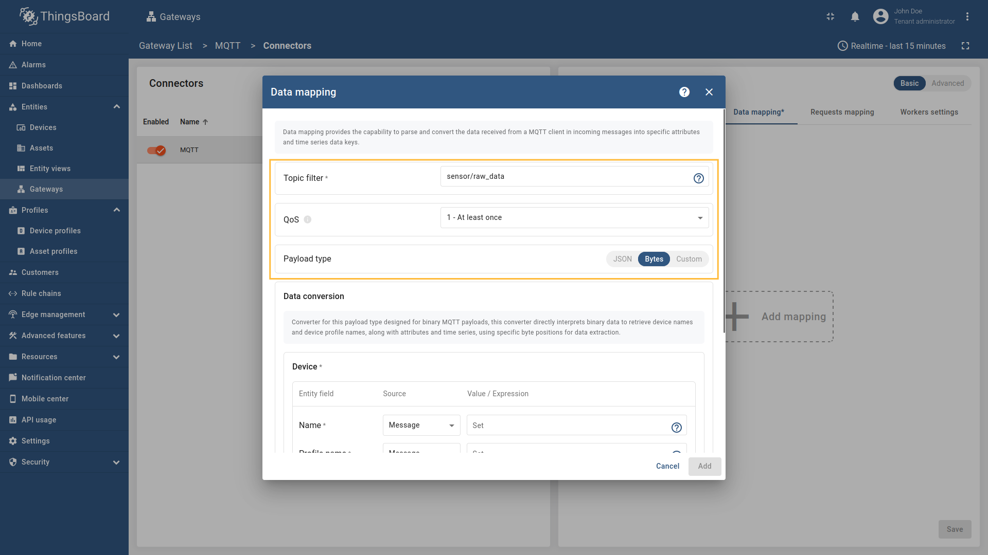 JSON、Bytes、Custom(关于支持的有效载荷类型的更多信息请参见附加信息转换器类型部分)。 - Device Name - ThingsBoard中的设备名称。可从