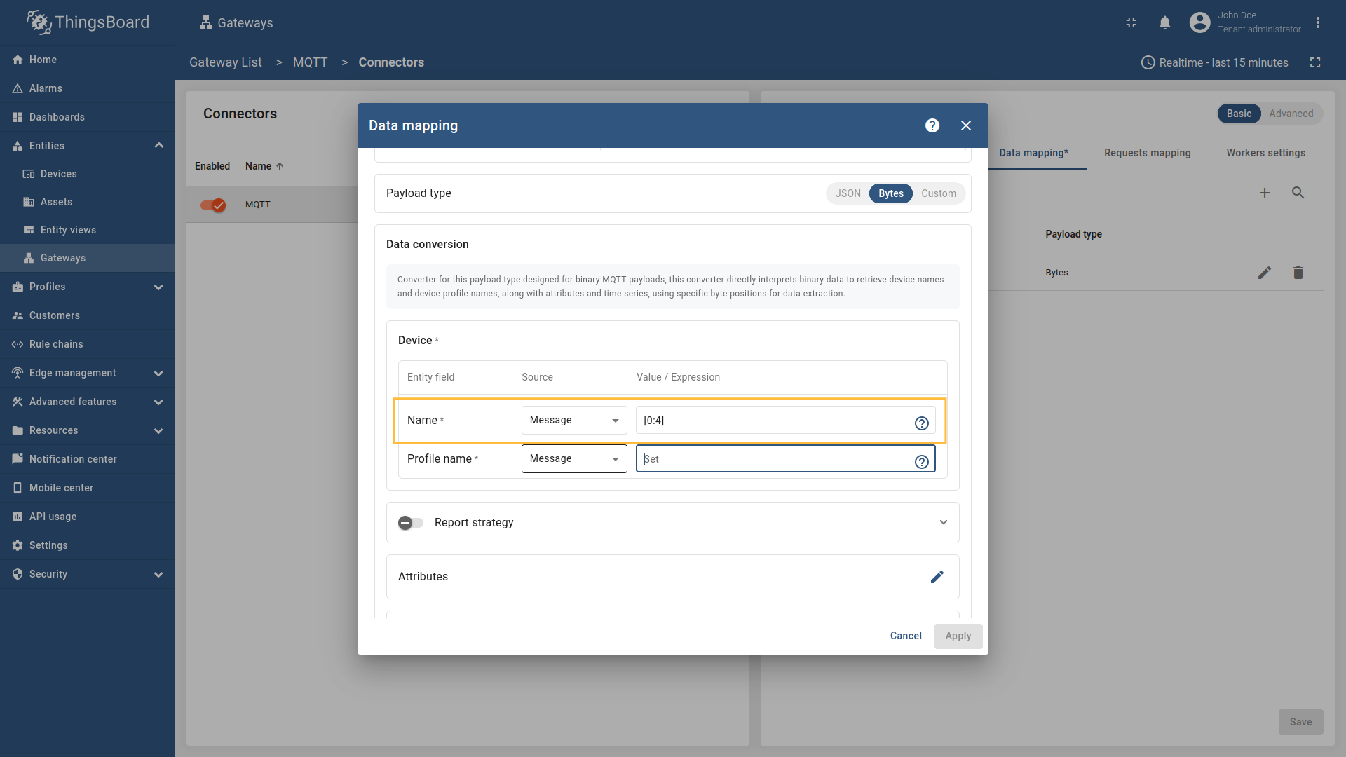 假设要从该负载创建设备。前四个字节表示设备名,其余字节表示温度值。 配置 MQTT 连接器,从原始字节提取设备名,并使用常量作为设备配置(例如 按以下步骤操作: