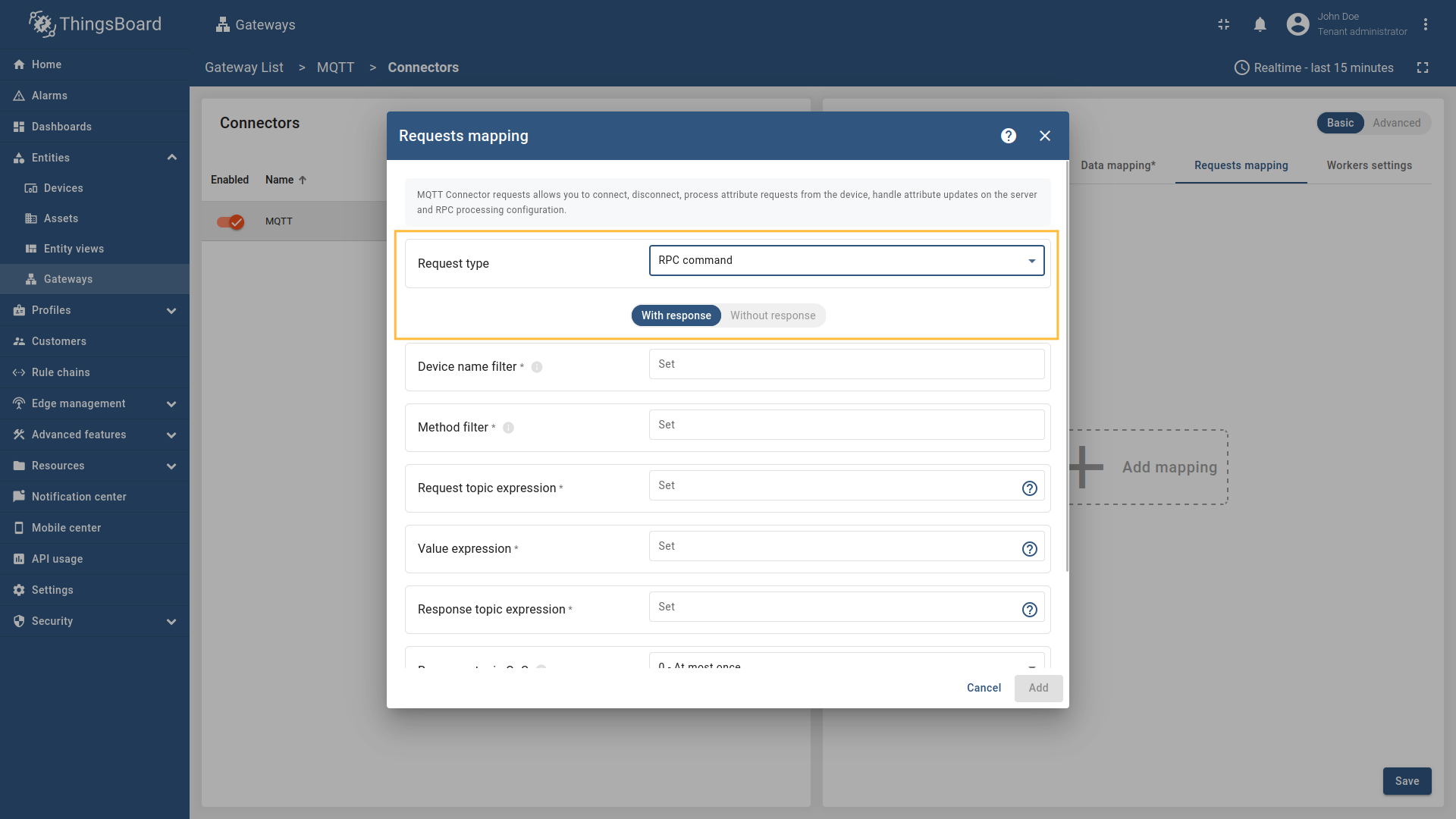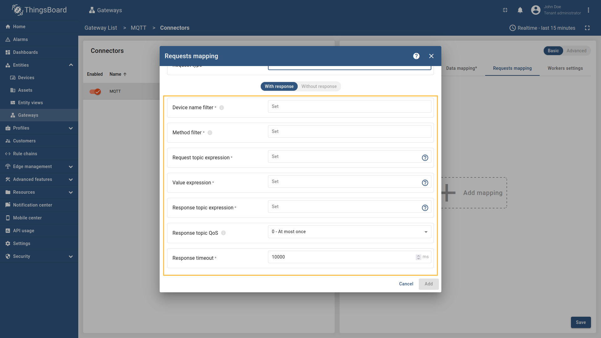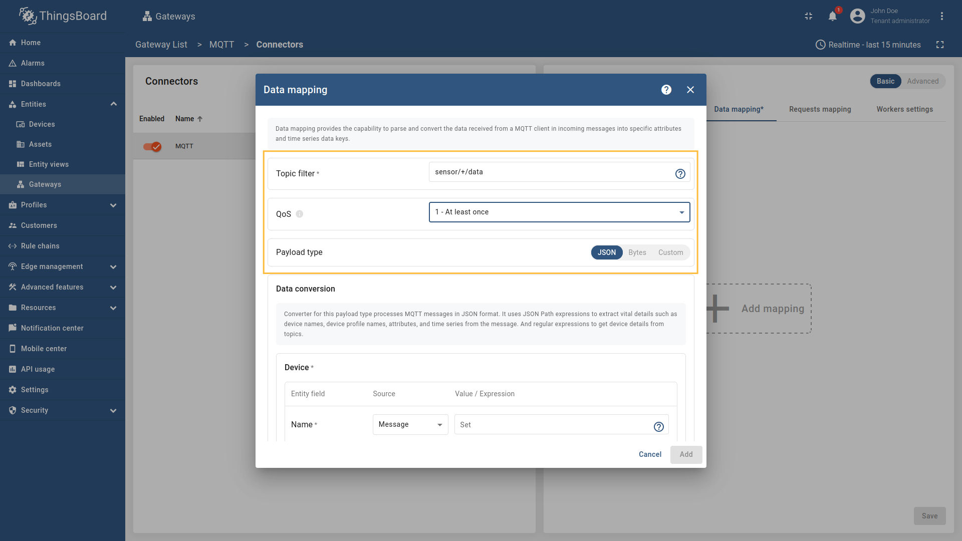 在左侧边栏进入“实体”→“网关”并选择您的网关。 点击右侧菜单中的“连接器配置”按钮。 选择已创建的 MQTT 连接器,选择“基本”并点击“数据映射”,再点击“+ 添加映射”按钮。 在打开的窗口中,“主题过滤器”填 在“设备”子部分,“名称”字段选“Topic”,填 在“配置文件名称”子部分,“名称”字段选“Constant”,填 还需要至少添加一个属性/时序数据,因为连接器不会添加无可读数据的设备。点击“时序数据”旁的“铅笔”图标。 在打开的窗口中,点击“添加时序数据”按钮并按对应图片填写字段。不要忘记保存更改。 可以检查设备名和配置文件是否正确设置。进入“实体”→“设备”,设备名应为