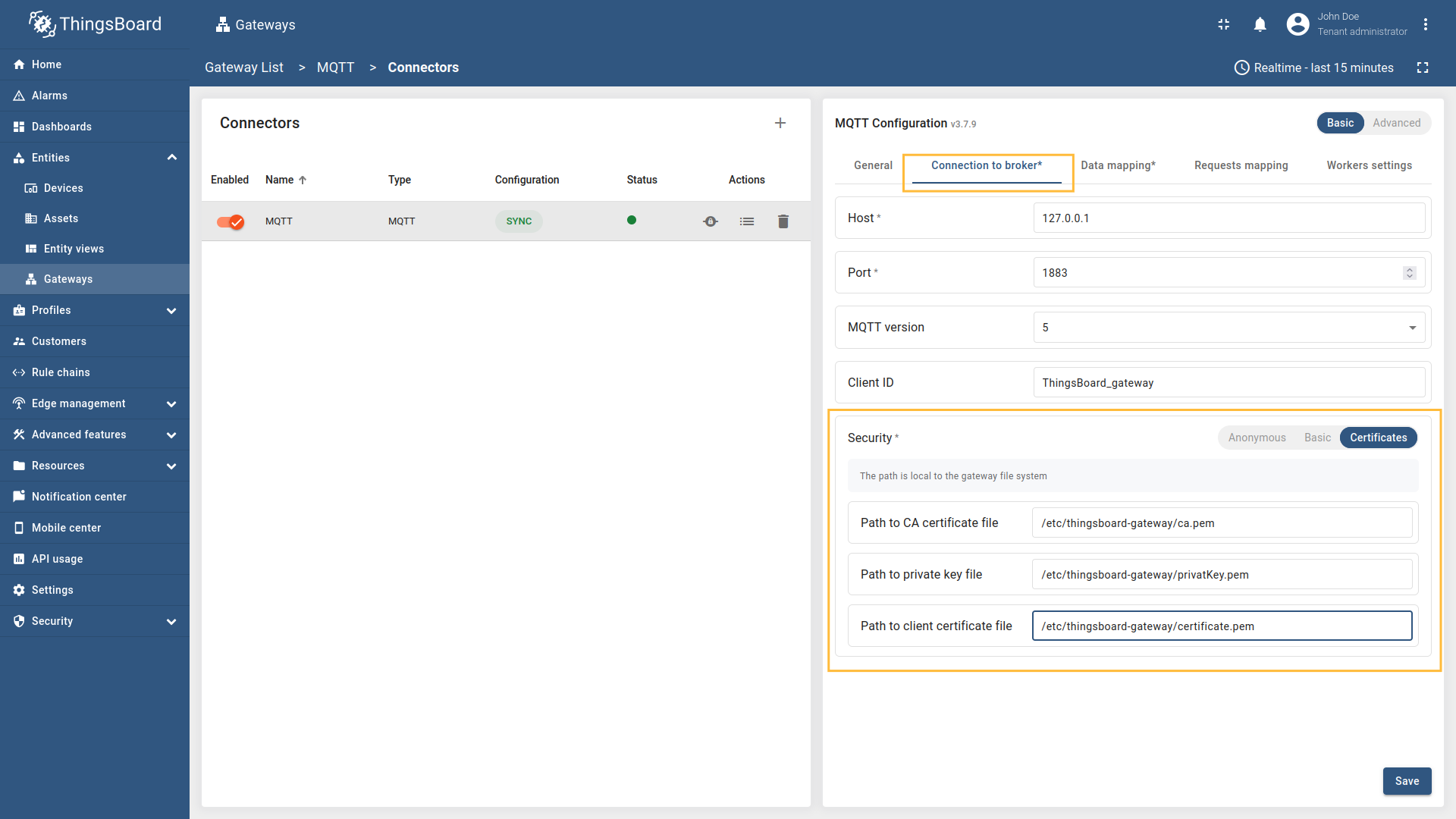 MQTT(消息队列遥测传输)是一种轻量级的发布-订阅式机器对机器网络协议,广泛用于资源受限或网络传输速率有限的远程设备连接。本文档将帮助您为ThingsBoard IoT网关设置MQTT连接器。我们将用简单的术语解释配置参数,使您易于理解和操作。 使用通用配置启用此连接器。