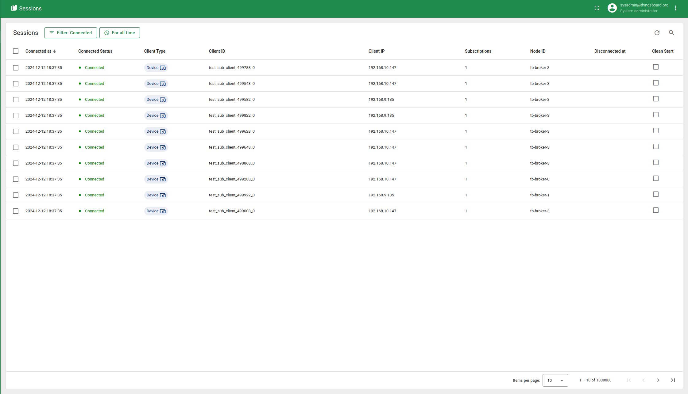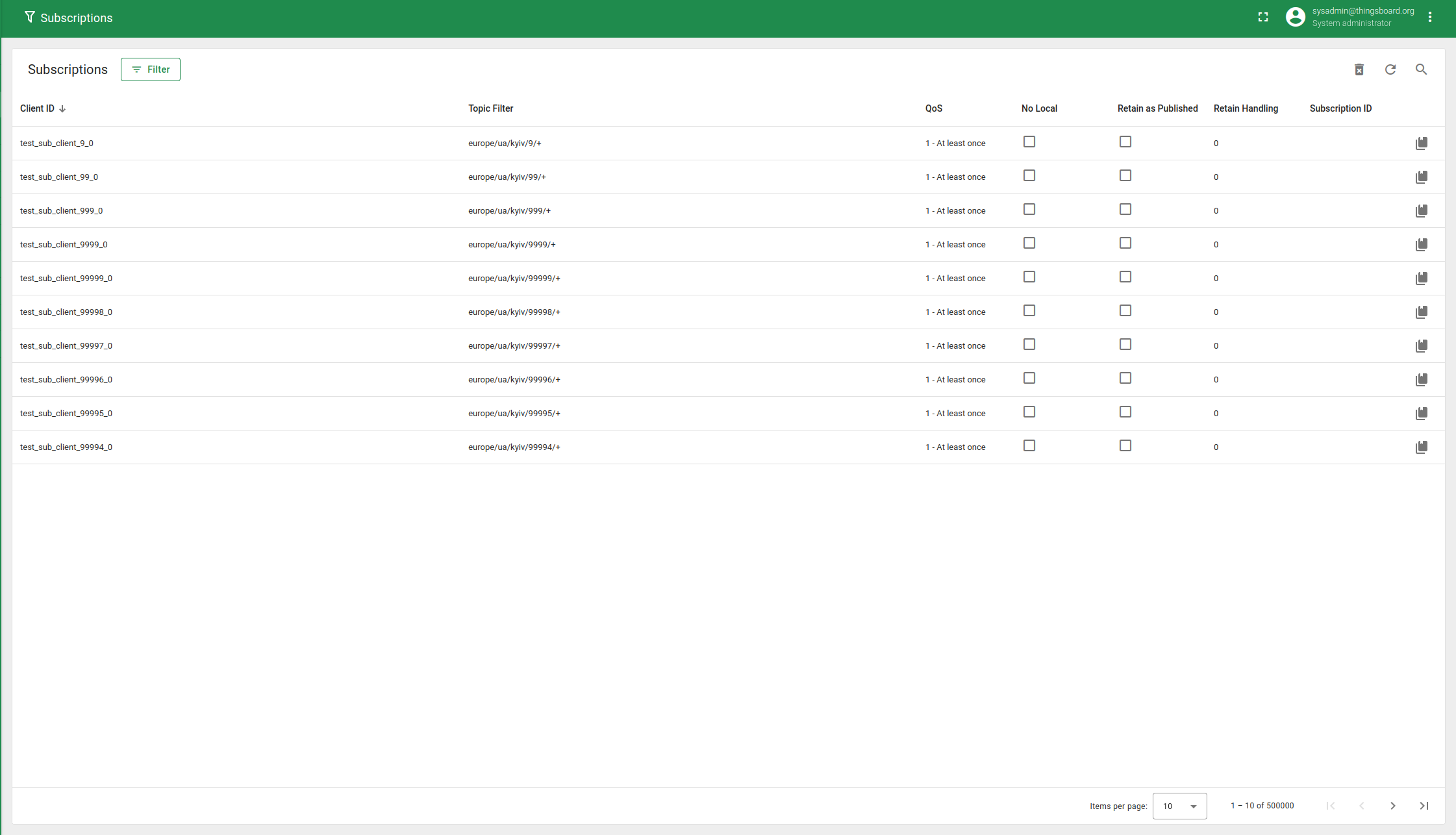 发布者每秒向唯一主题"europe/ua/kyiv/$number"发送62字节消息,