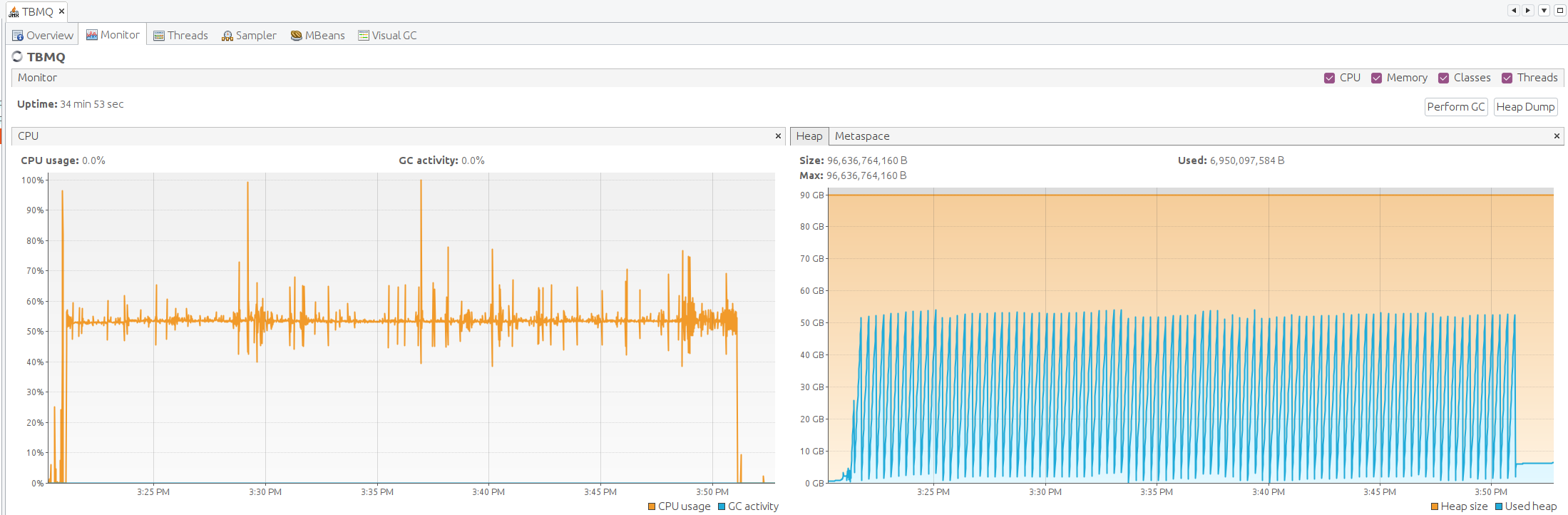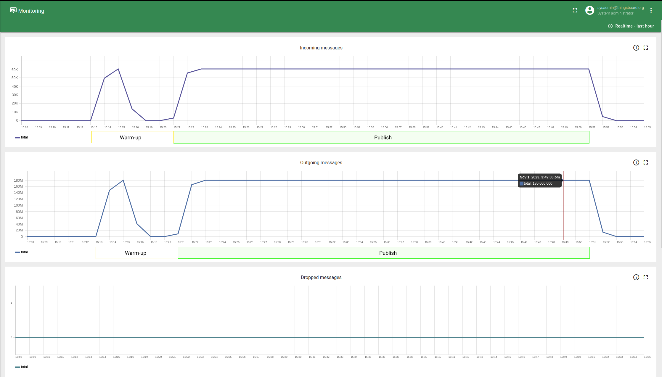 在30分钟的性能测试期间,我们验证TBMQ是否能够稳定处理大量消息负载, 而不会出现性能下降或资源耗尽。