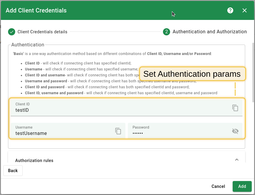 - 选择所需的 Credentials Type,并配置认证参数和授权规则。