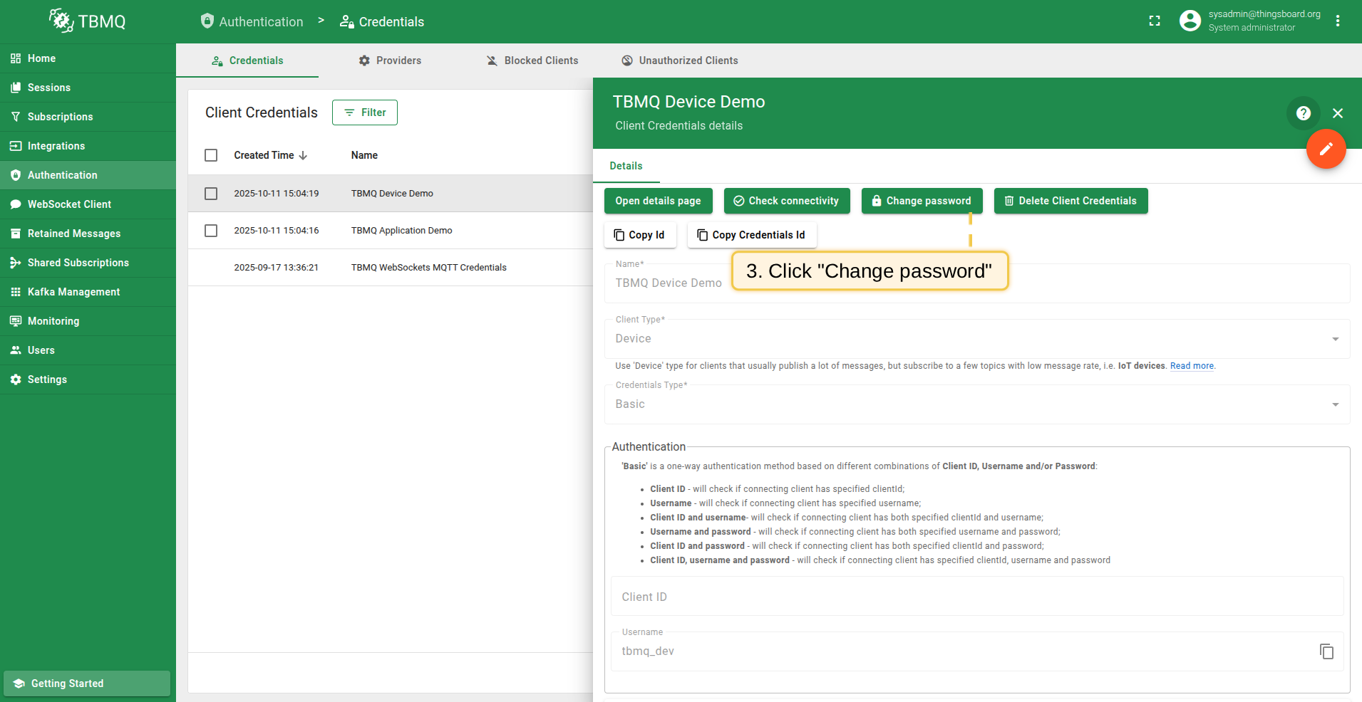 Broker管理员可修改MQTT Basic客户端凭据的密码。操作步骤:
