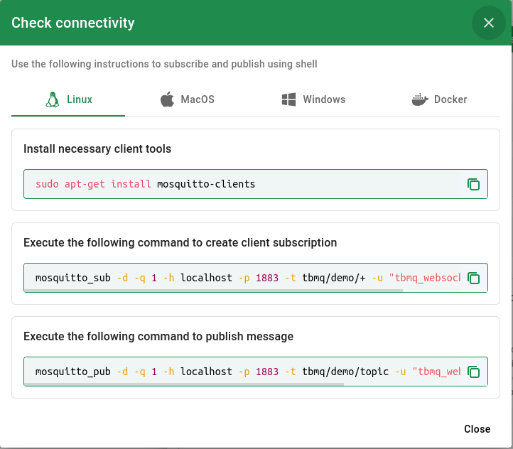 “Check Connectivity” 工具可自动生成用于订阅主题和发布消息的命令。 该功能使用用户配置的host、port和客户端凭据生成所需命令。
