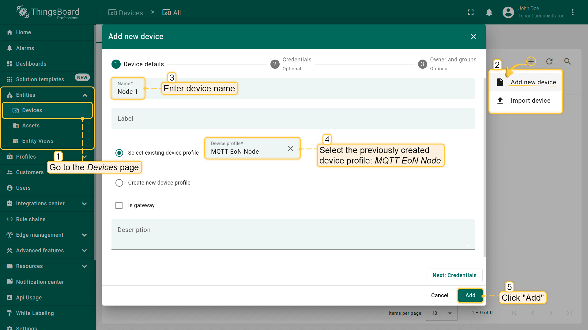 - 输入EoN节点设备名称(如Node 1)并选择现有设备配置:MQTT EoN Node。