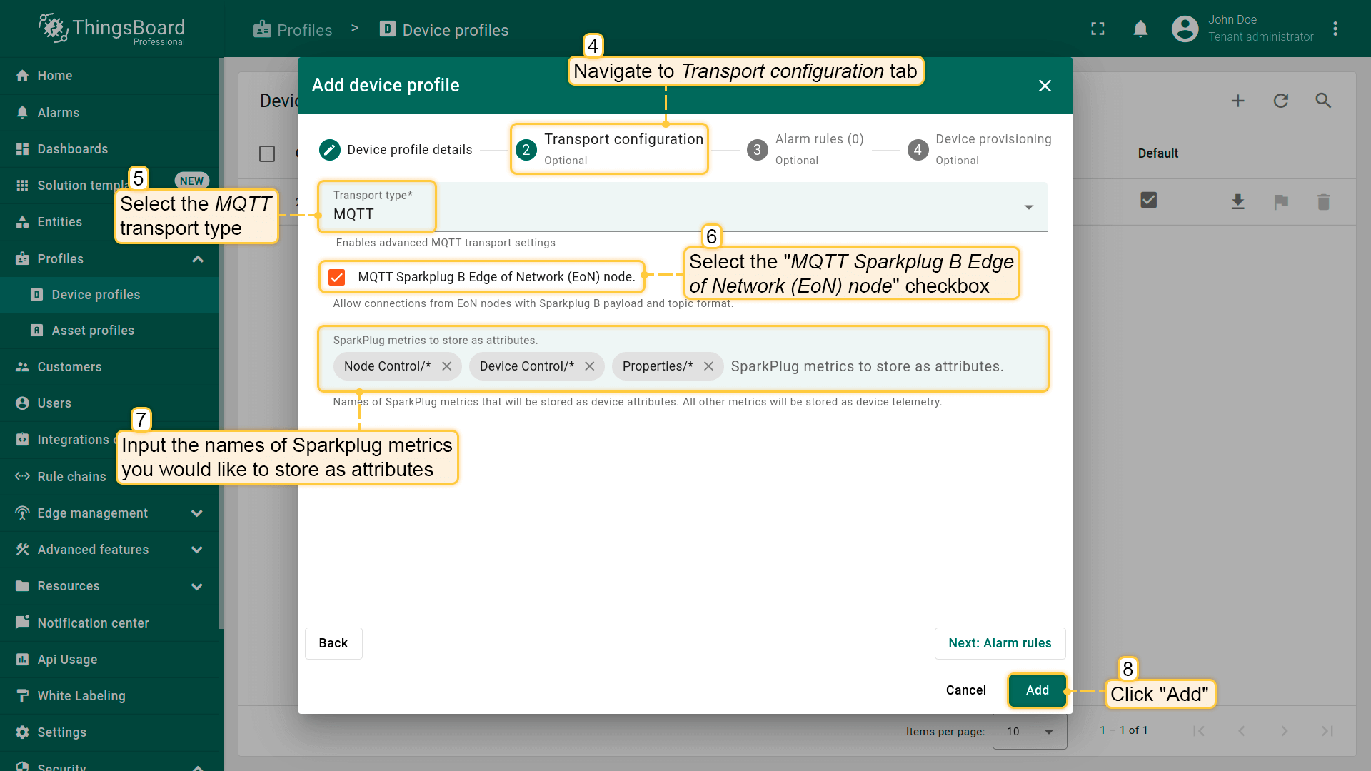 ThingsBoard充当MQTT服务器,支持SparkPlug负载和主题结构,并允许来自MQTT网络边缘(EoN)节点的连接。