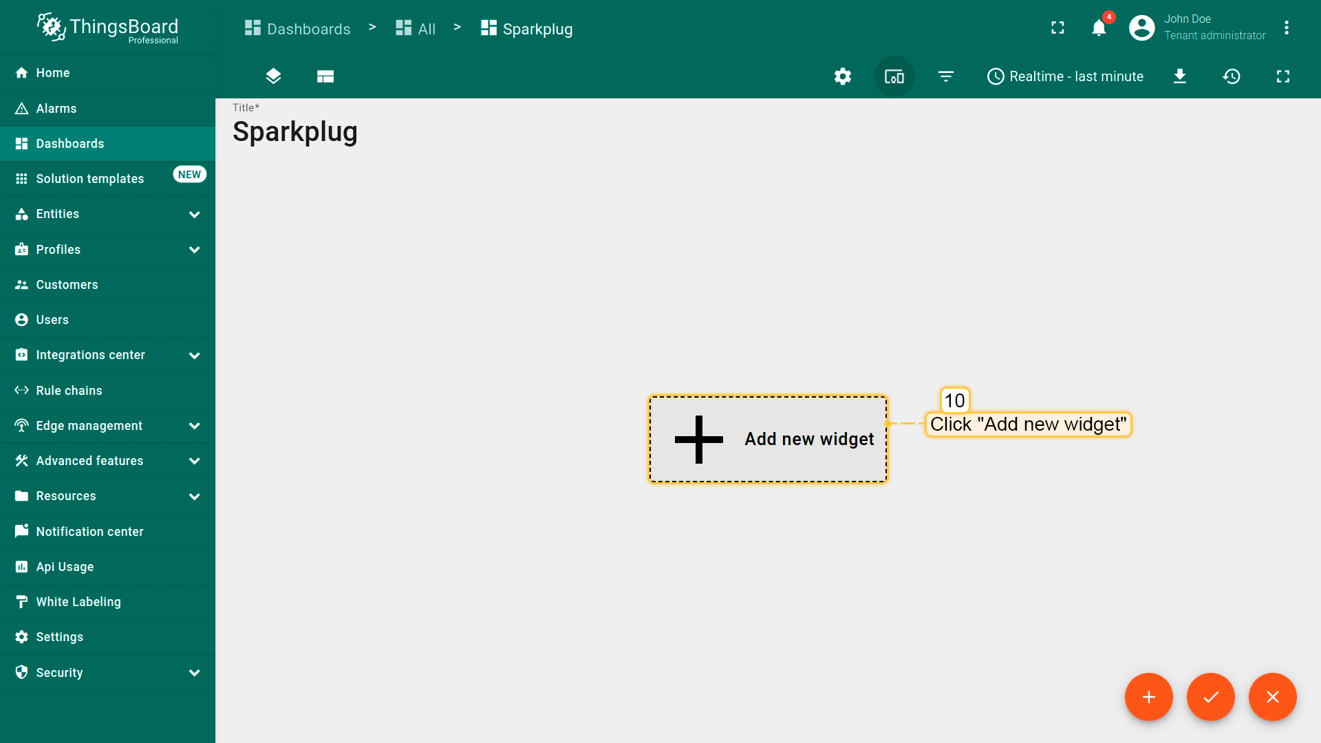 进入仪表板页面并创建名为Sparkplug的新仪表板。打开仪表板,点击实体别名图标添加新别名。 命名别名(例如EoN Node),选择筛选类型”单个实体“,类型”设备“并选择Node 1。点击添加然后保存。