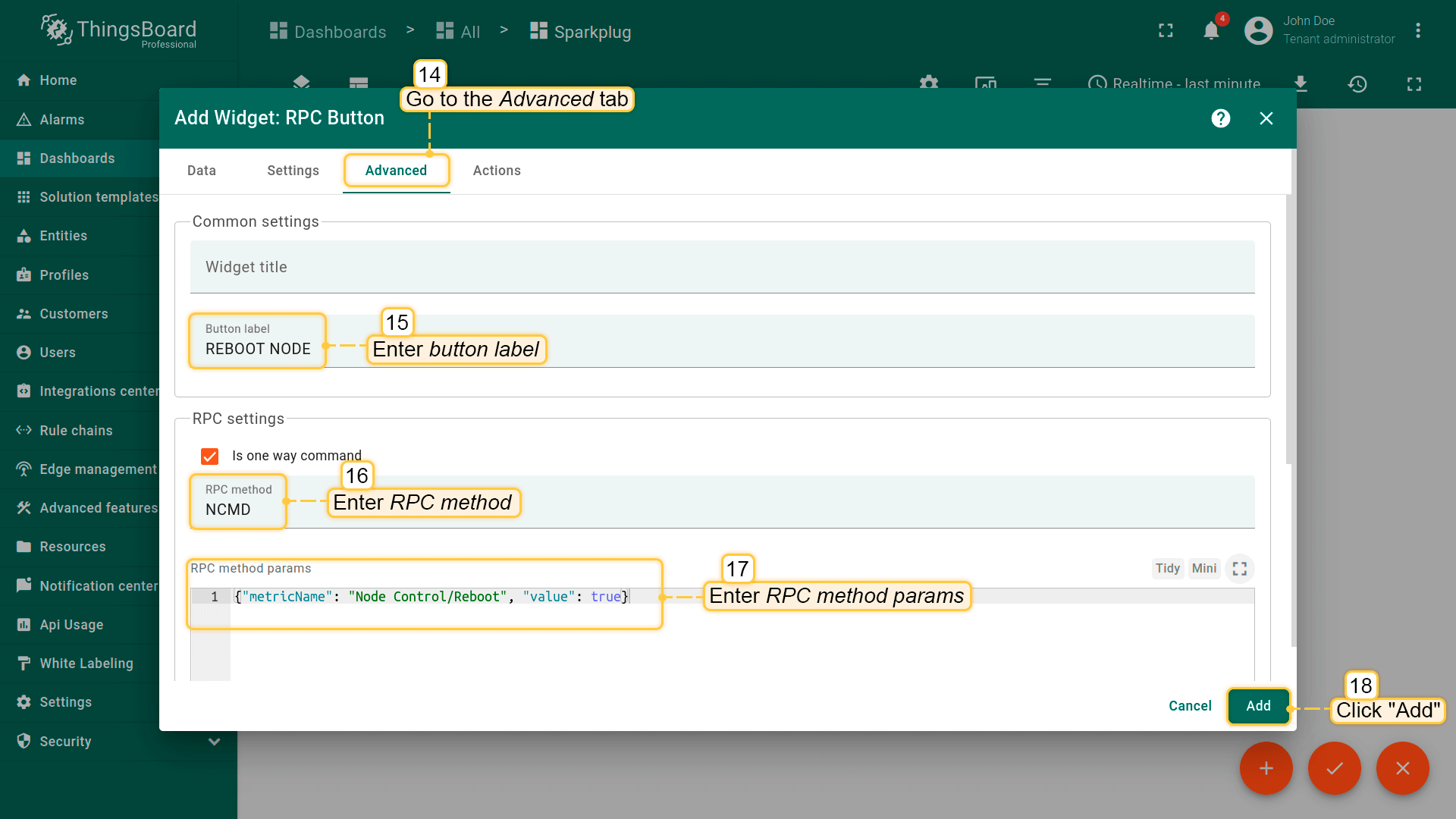 现在创建新部件。点击”添加新部件”,从下拉菜单选择控制部件包并选择RPC按钮部件。在数据字段选择已创建的别名(EoN Node)。 进入高级选项卡并输入按钮标签 - REBOOT NODE。在RPC设置中输入RPC方法 - “NCMD”(发给EoN节点的命令)和RPC方法参数 - “{“metricName”: “Node Control/Reboot”, “value”: true}“。点击添加并保存更改。