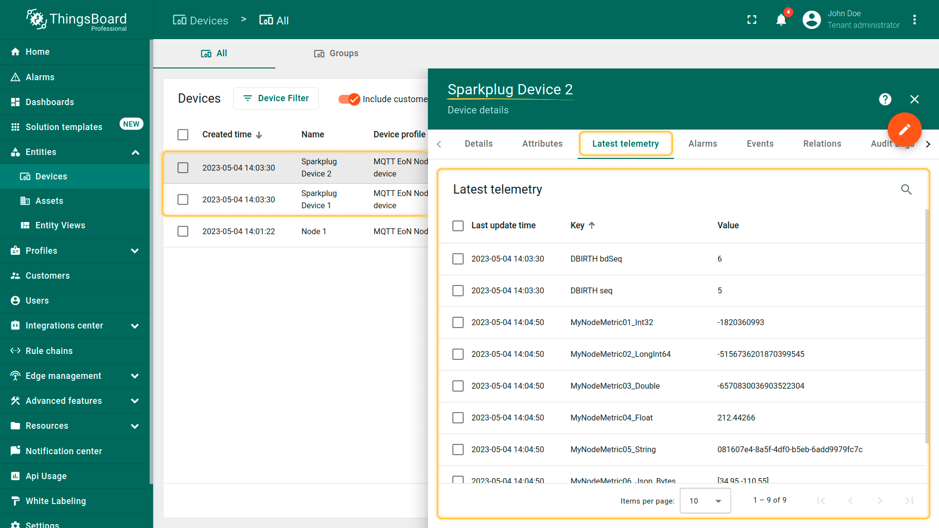 单个EoN节点可代表多个物理设备和传感器,并为每个设备上传设备指标。 ThingsBoard从Sparkplug负载解码设备指标,并将其存储为相应设备的属性或时序数据。 您也可通过共享属性更新或RPC命令向Sparkplug设备发出更新。