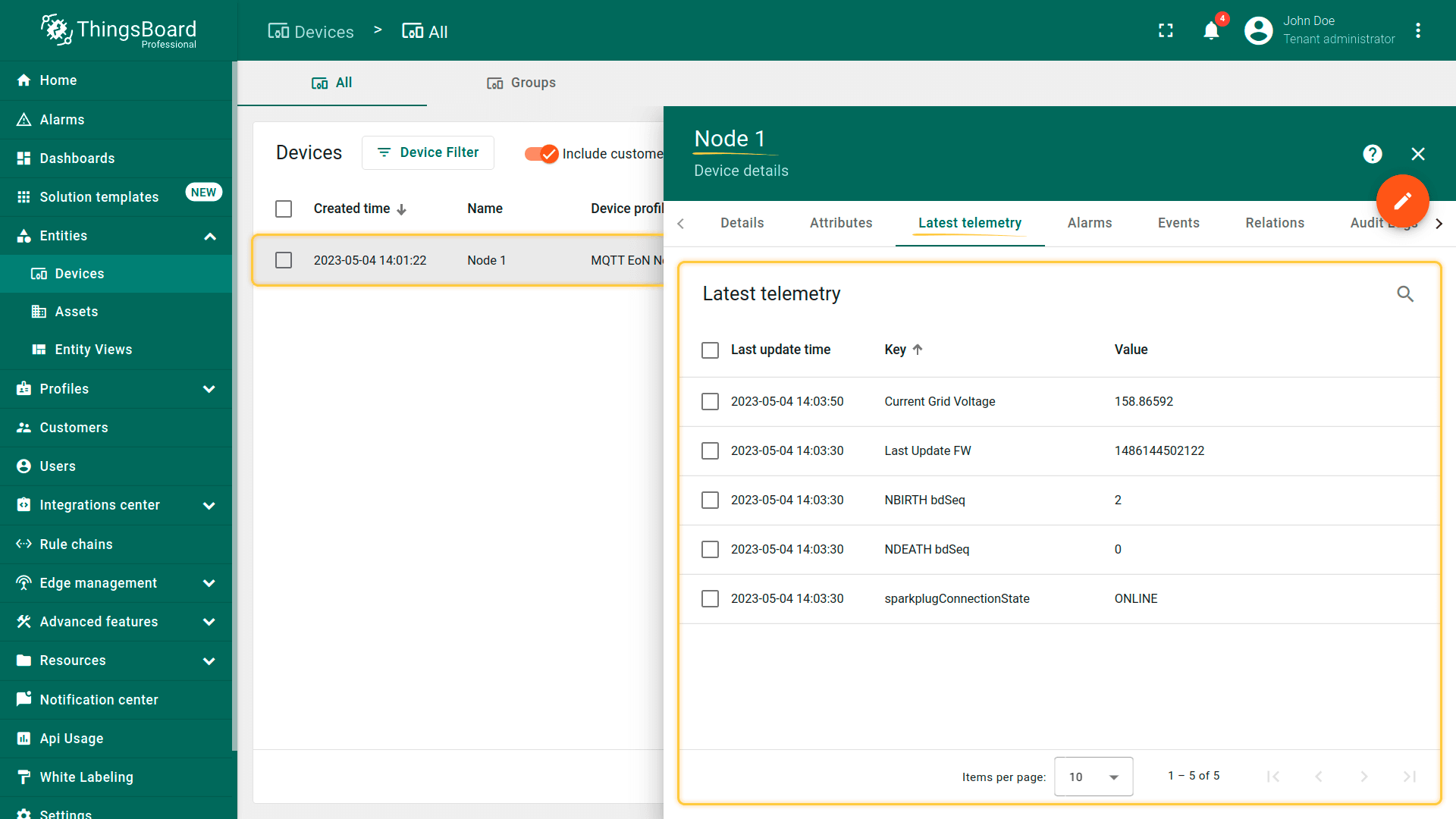 进入EoN节点设备(如Node 1)的详情并打开最新遥测选项卡。您应看到设备指标,例如Current Grid Voltage。 进入属性选项卡并选择共享属性范围。您将看到在步骤1(第5项)中先前配置的指标。