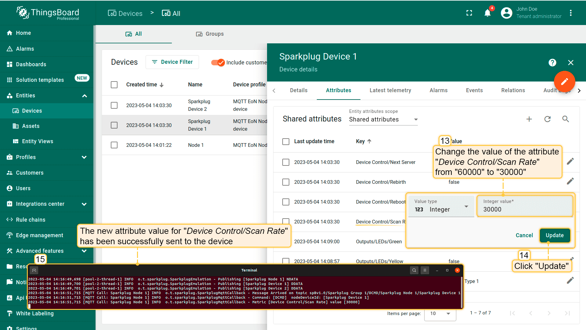 使用ThingsBoard RPC命令从服务器向MQTT EoN/设备更新指标