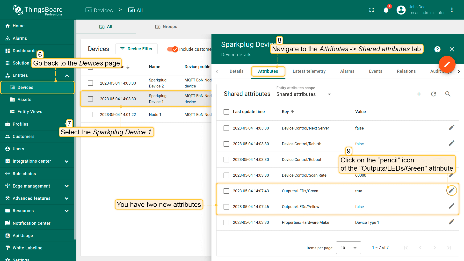 返回设备页面并选择Sparkplug Device 1。 在共享属性选项卡中,您将看到两个新属性:”Outputs/LEDs/Green“值为”true“,”Outputs/LEDs/Yellow“值为”false“。 这些为存储为属性的指标,我们可修改并将其值发送至设备。