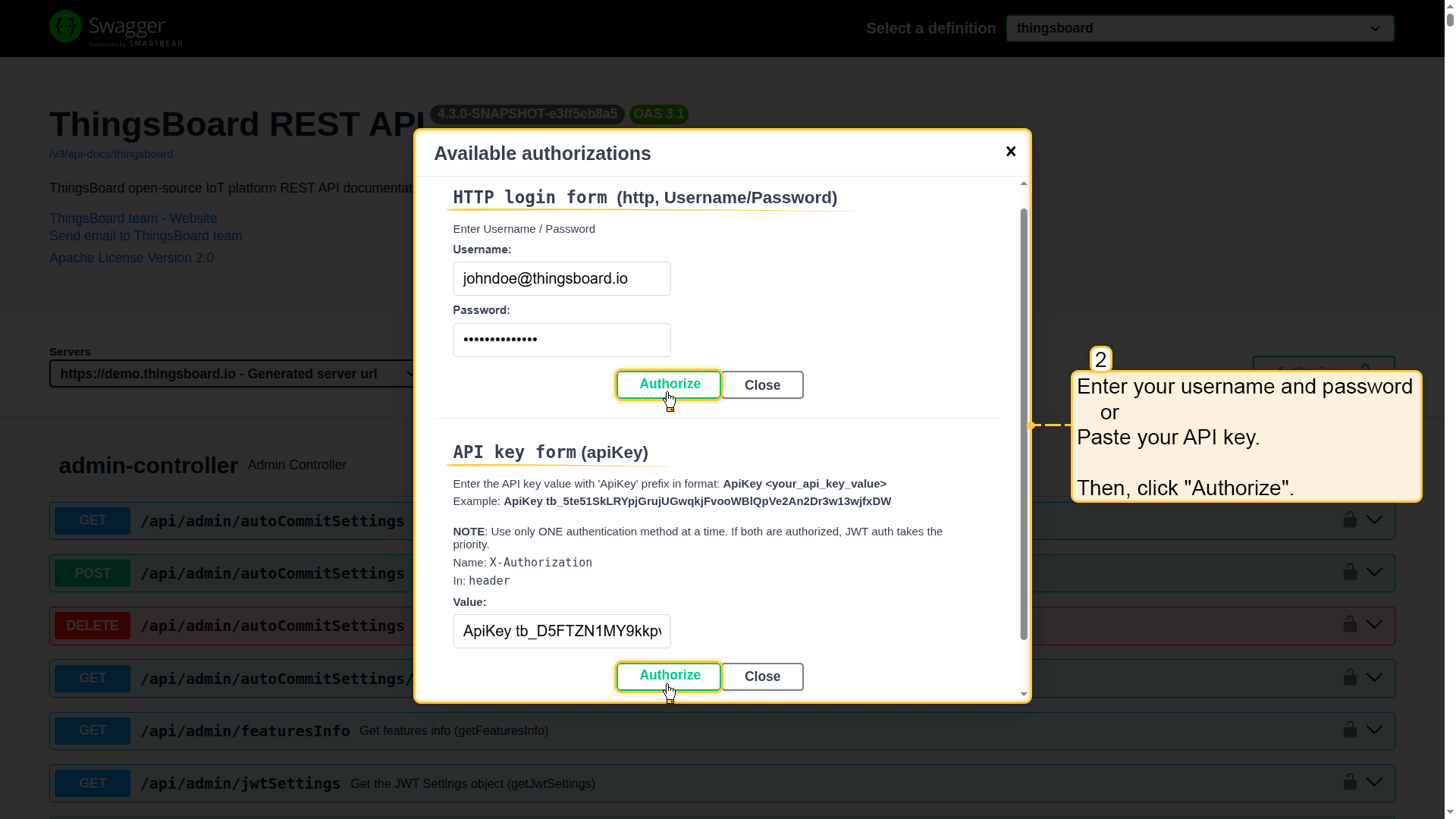 若已通过主ThingsBoard UI登录,Swagger UI将自动使用当前会话。