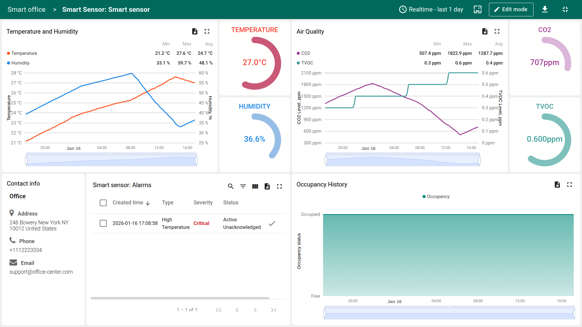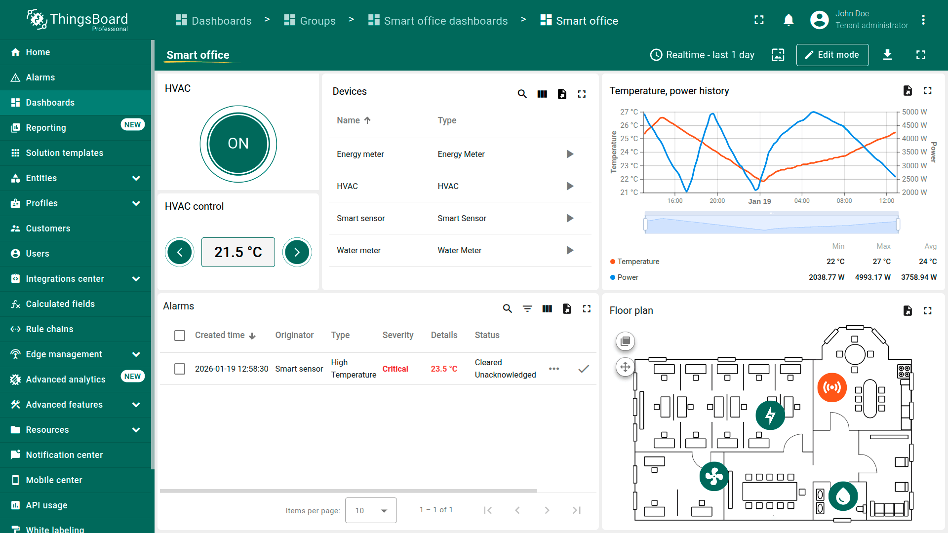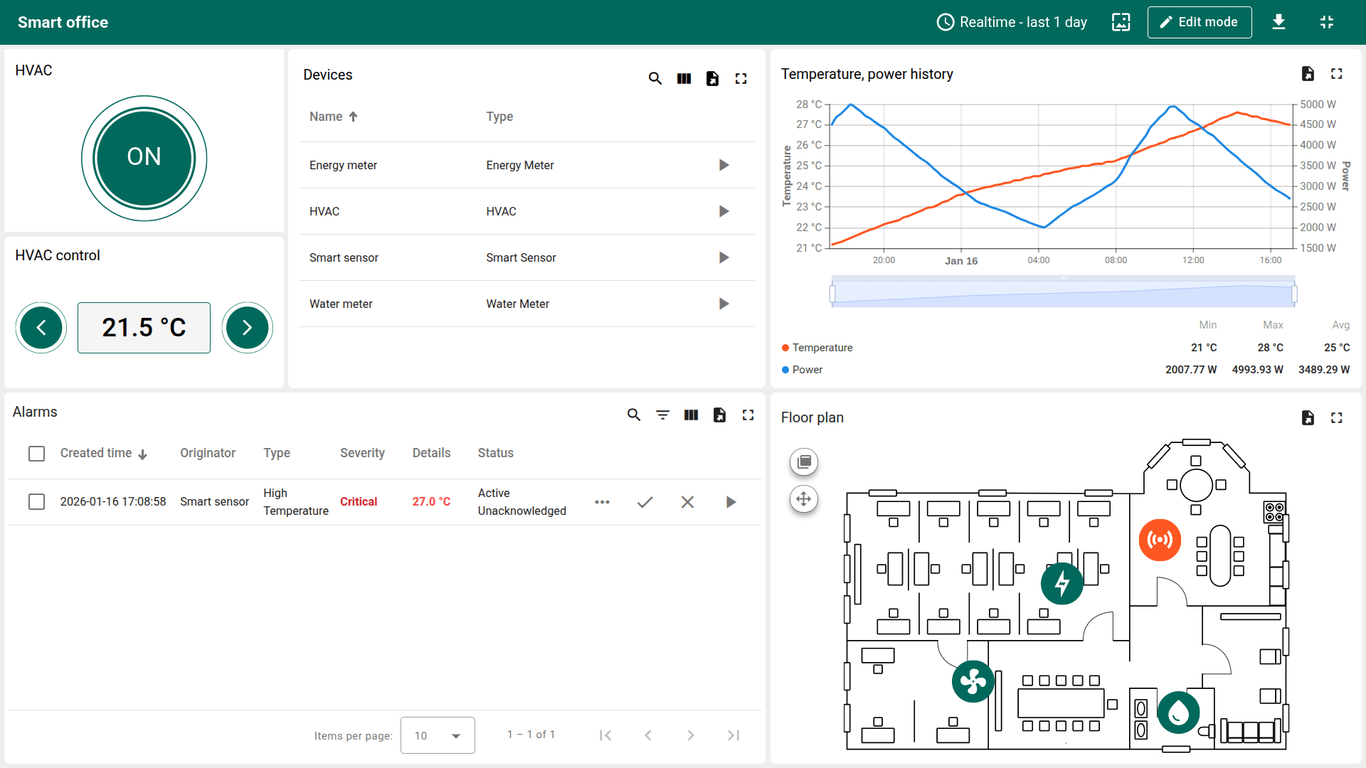 Smart office解决方案模板为设施监测与控制提供即用基础,将环境感知、资源计量、告警与HVAC管理整合于单一解决方案。 支持快速部署、清晰的运营可见性,并易于扩展到真实办公与设施管理场景。