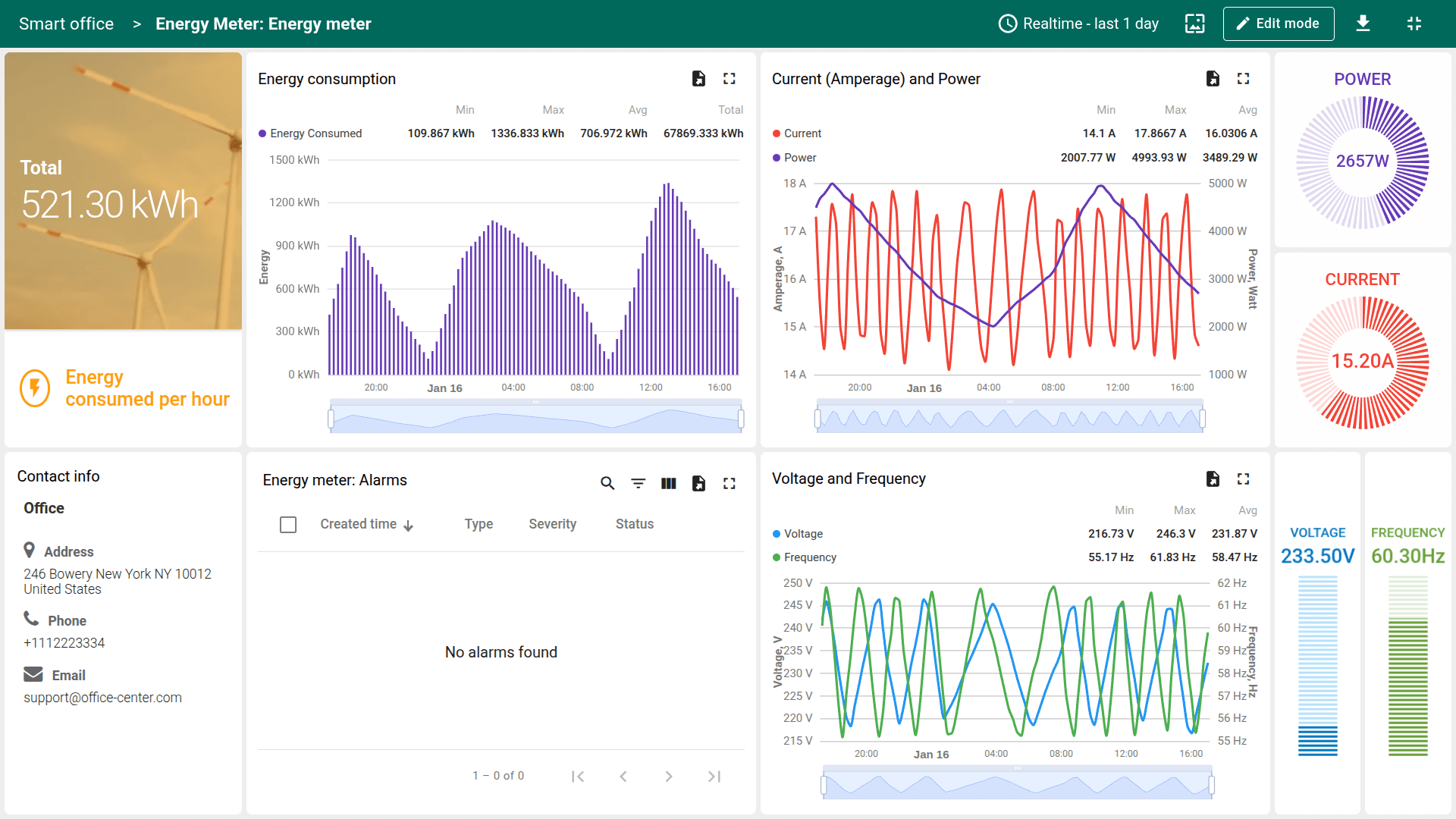 - 仪表板。Smart Office仪表板提供环境与用电数据的交互可视化、基于平面图的设备表示、集中告警监测及用户界面中的直接HVAC控制。