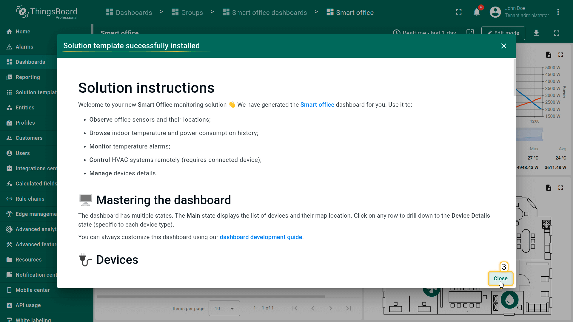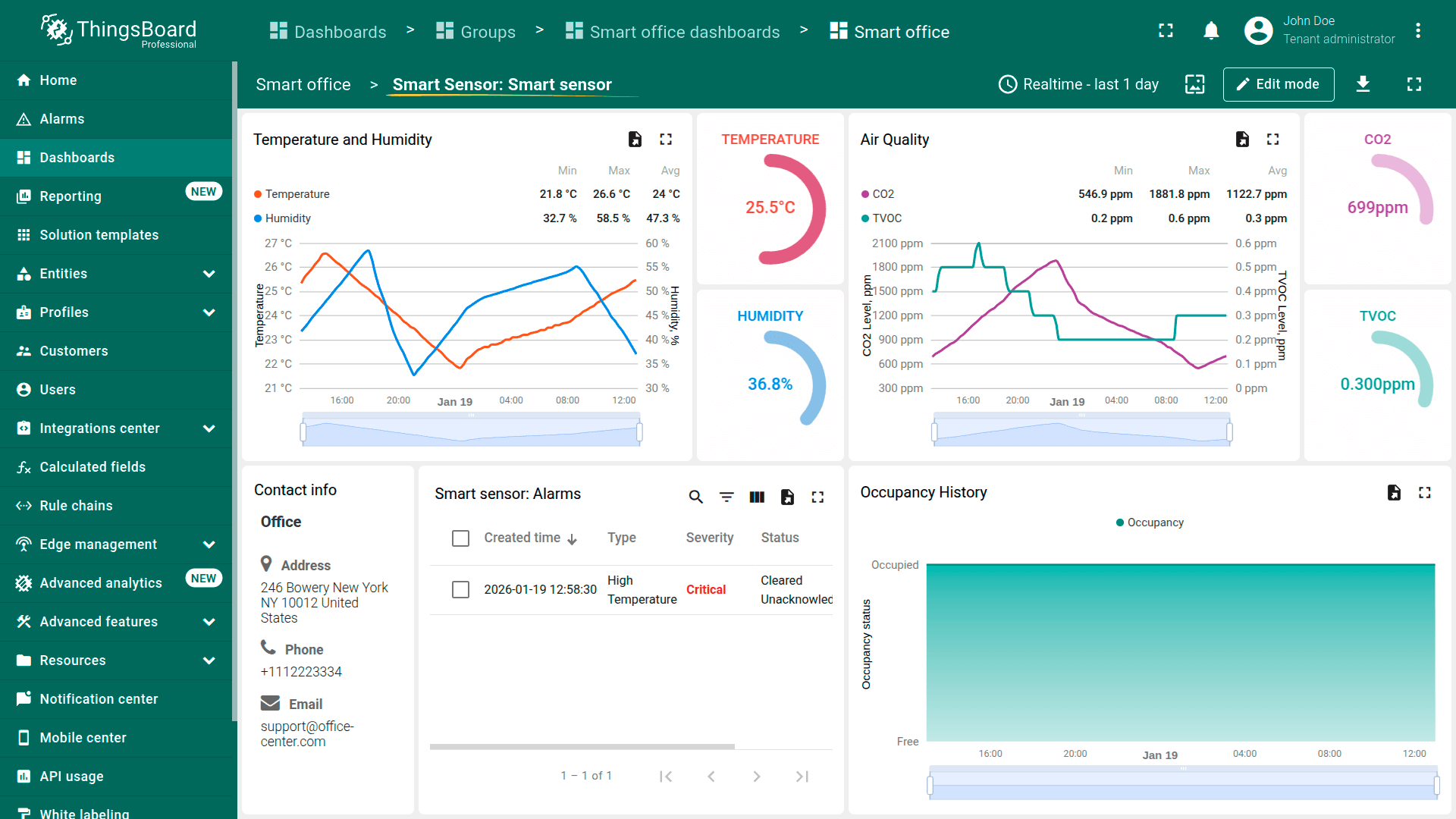 通过一次安装操作,模板将部署现代办公室的完整数字表示,包括传感器、计量表、HVAC控制、仪表板、告警与设备配置。无需自定义规则链、部件或后端配置。