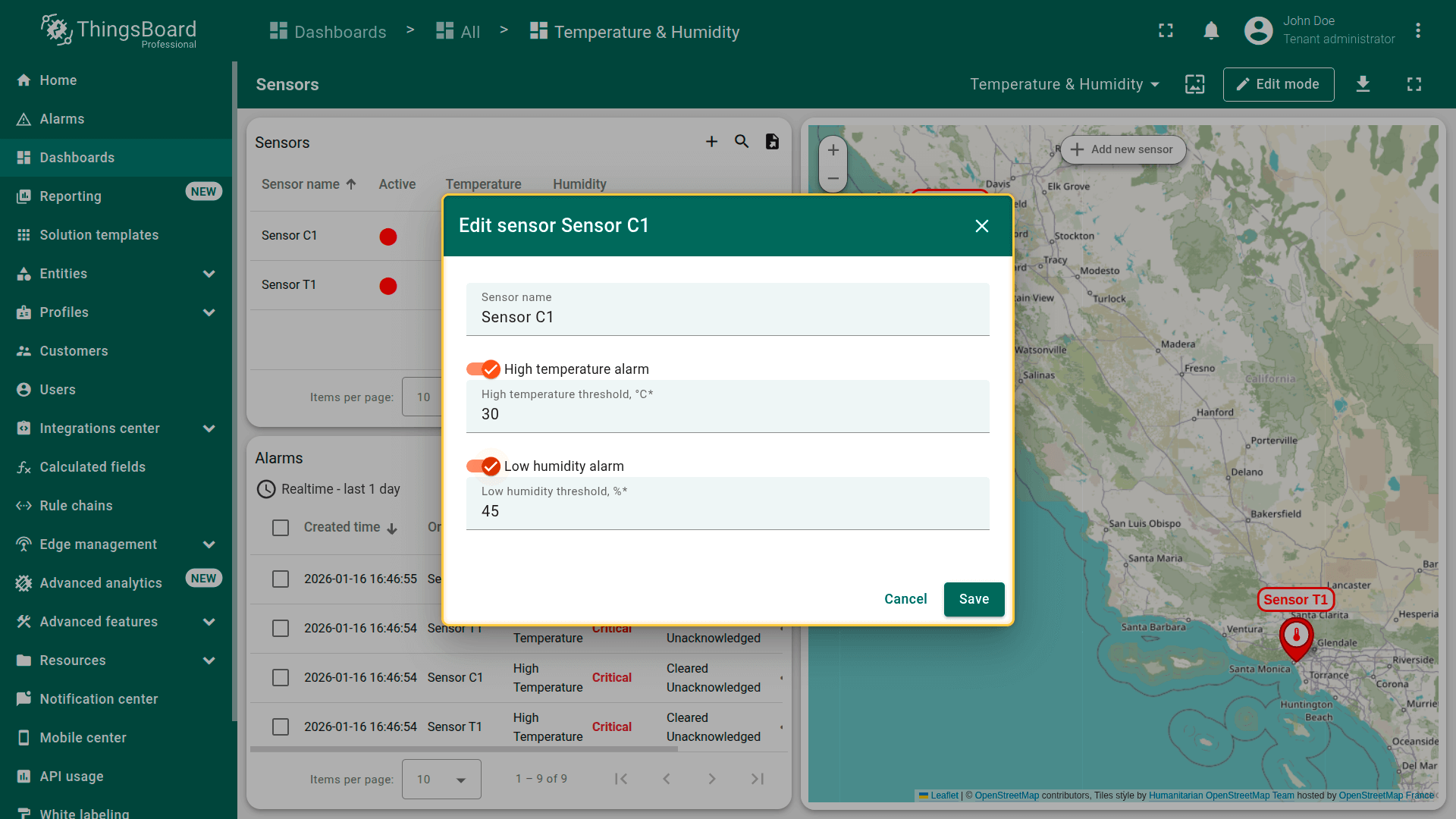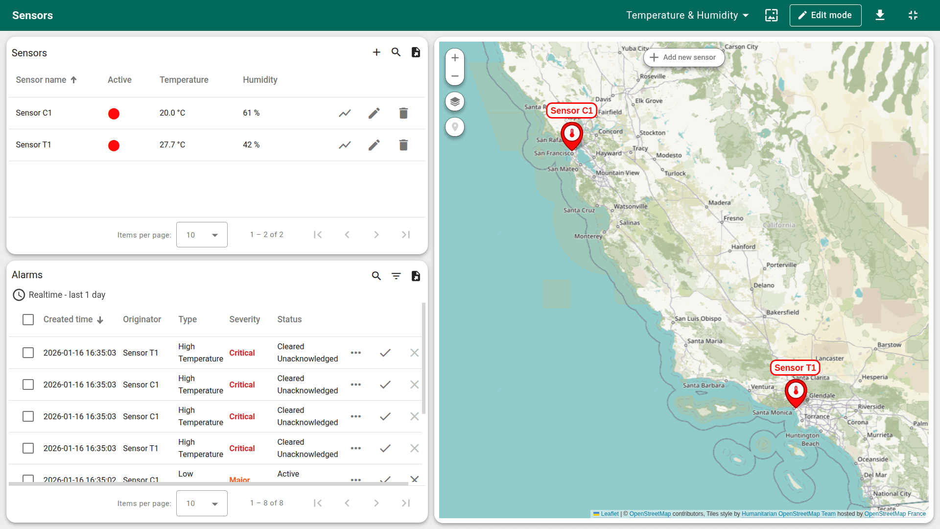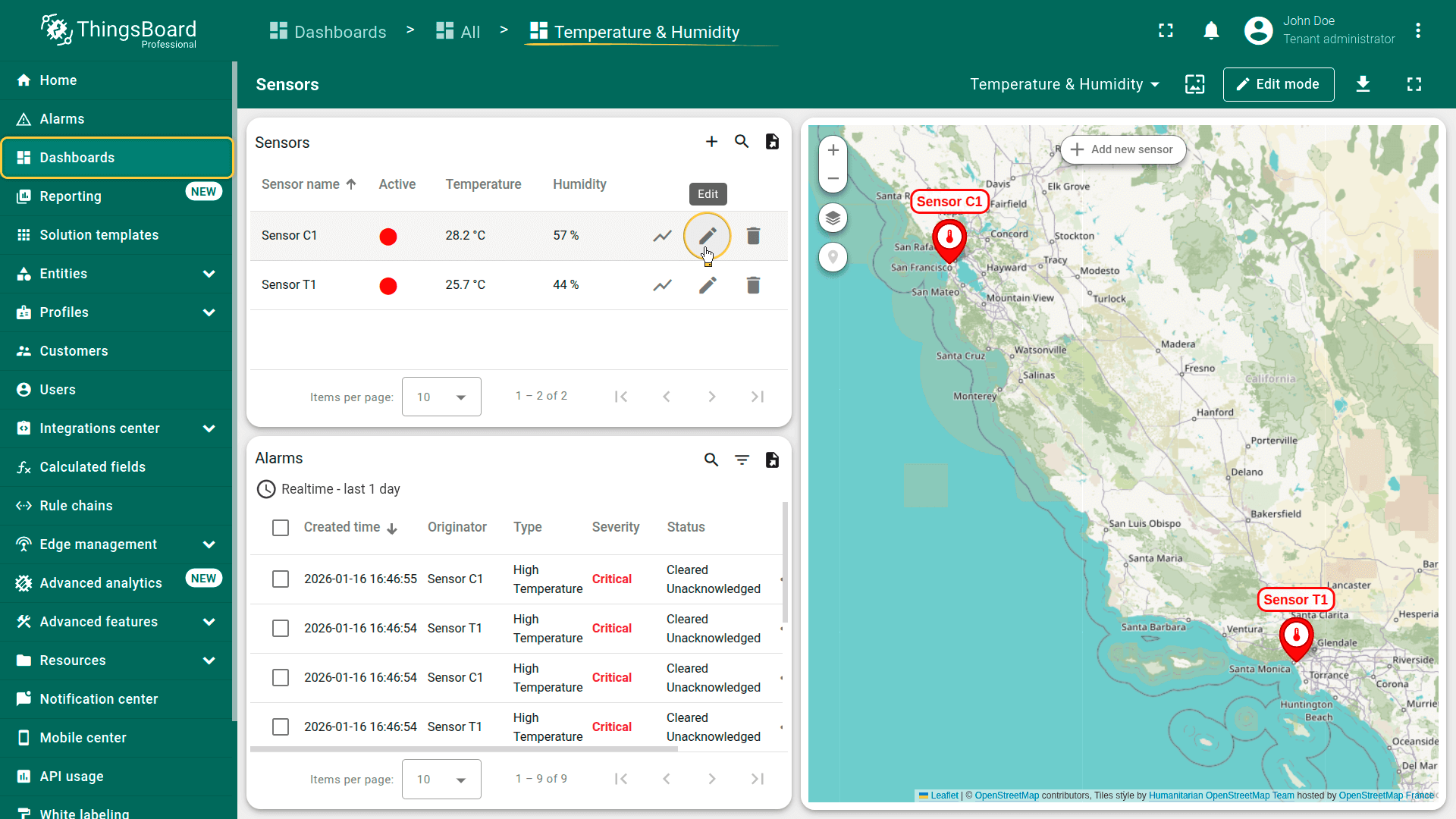 - 仪表板。Temperature & Humidity仪表板提供传感器遥测的实时可视化、告警管理、传感器配置及带设备位置的交互地图。
