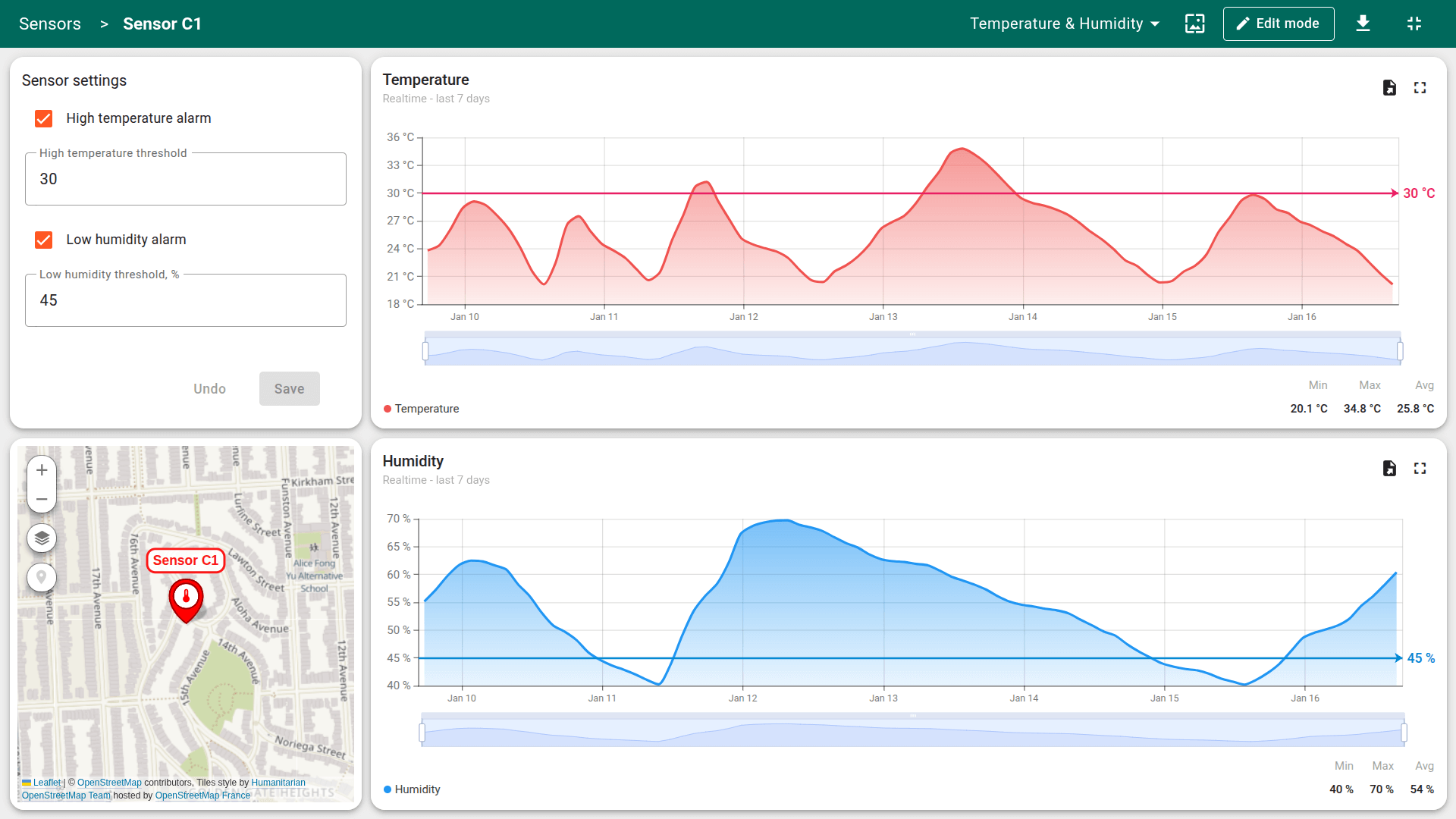 - Sensor Details state。选择传感器行时打开。 支持查看历史温度与湿度数据、编辑传感器参数并更改位置。