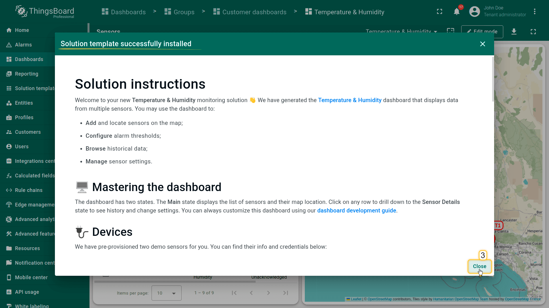 Temperature & Humidity sensors解决方案模板提供即用型环境条件监测系统。通过一次安装操作,模板将部署包含仪表板、设备、告警、用户与访问控制的完整功能解决方案。