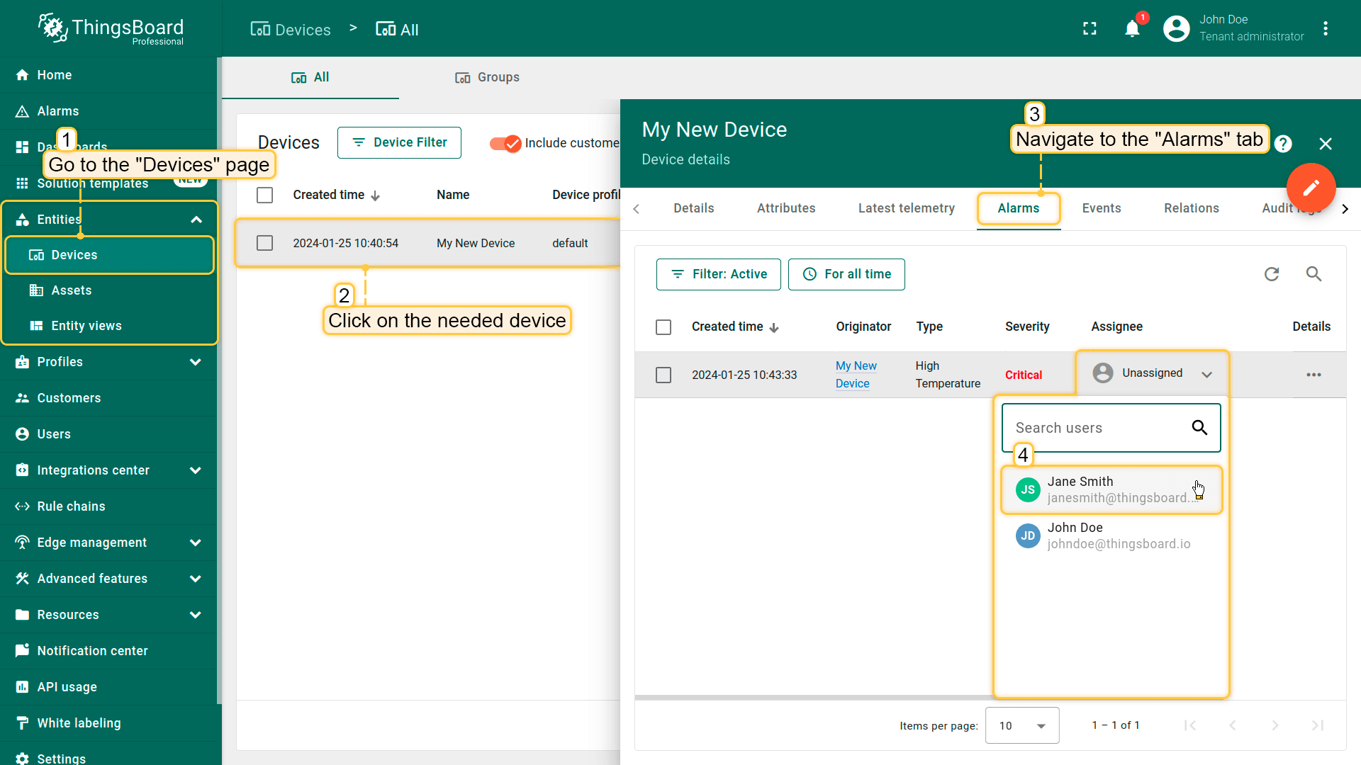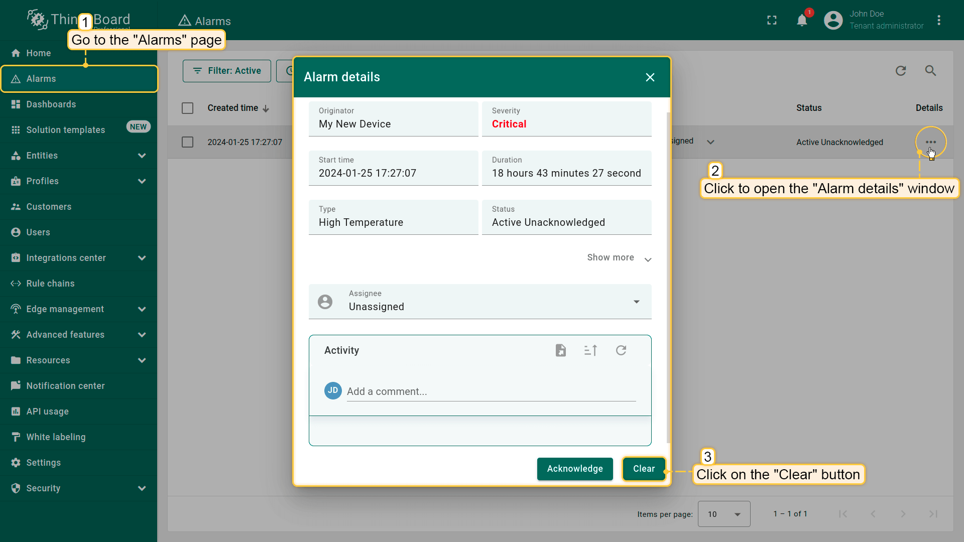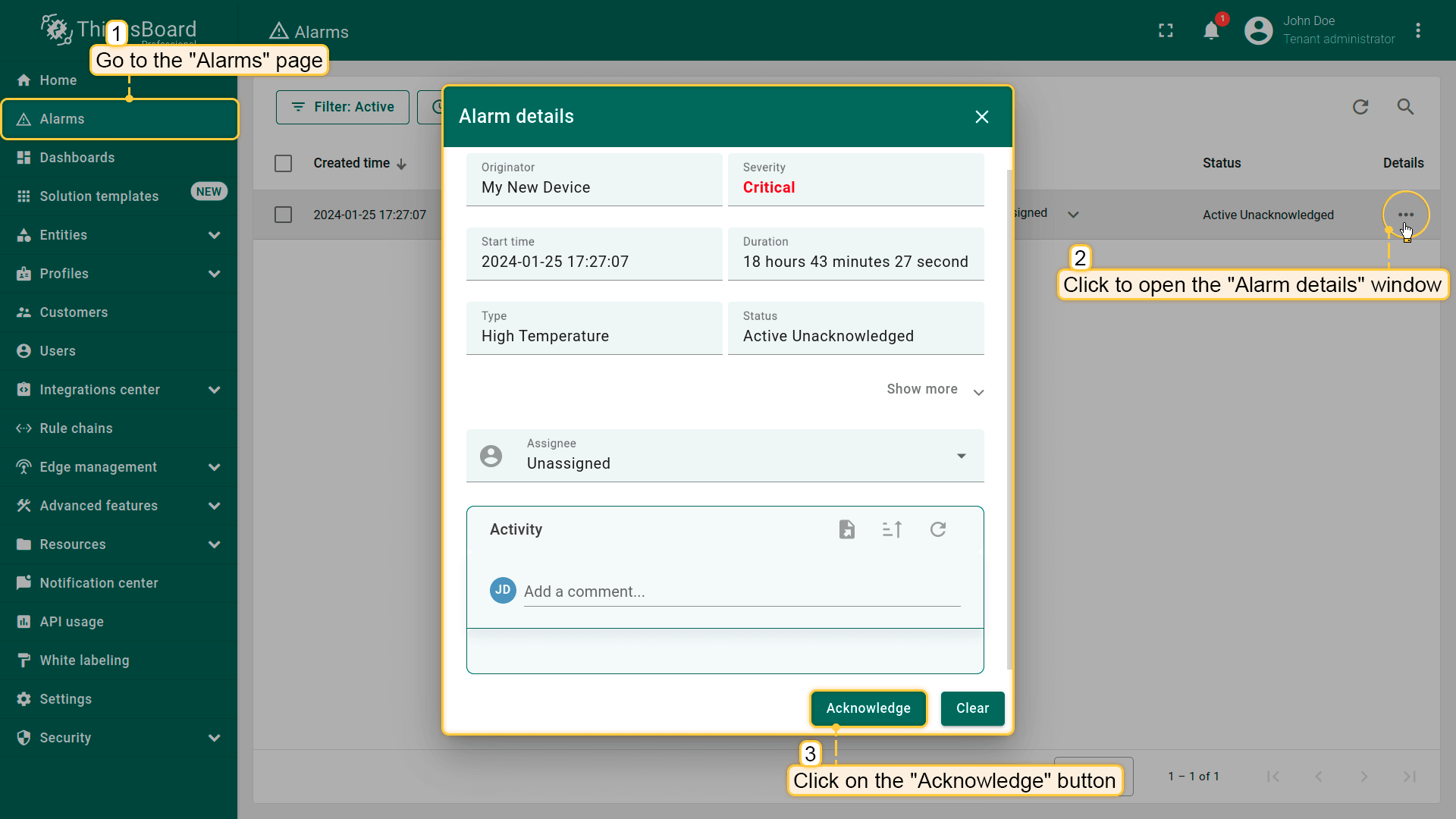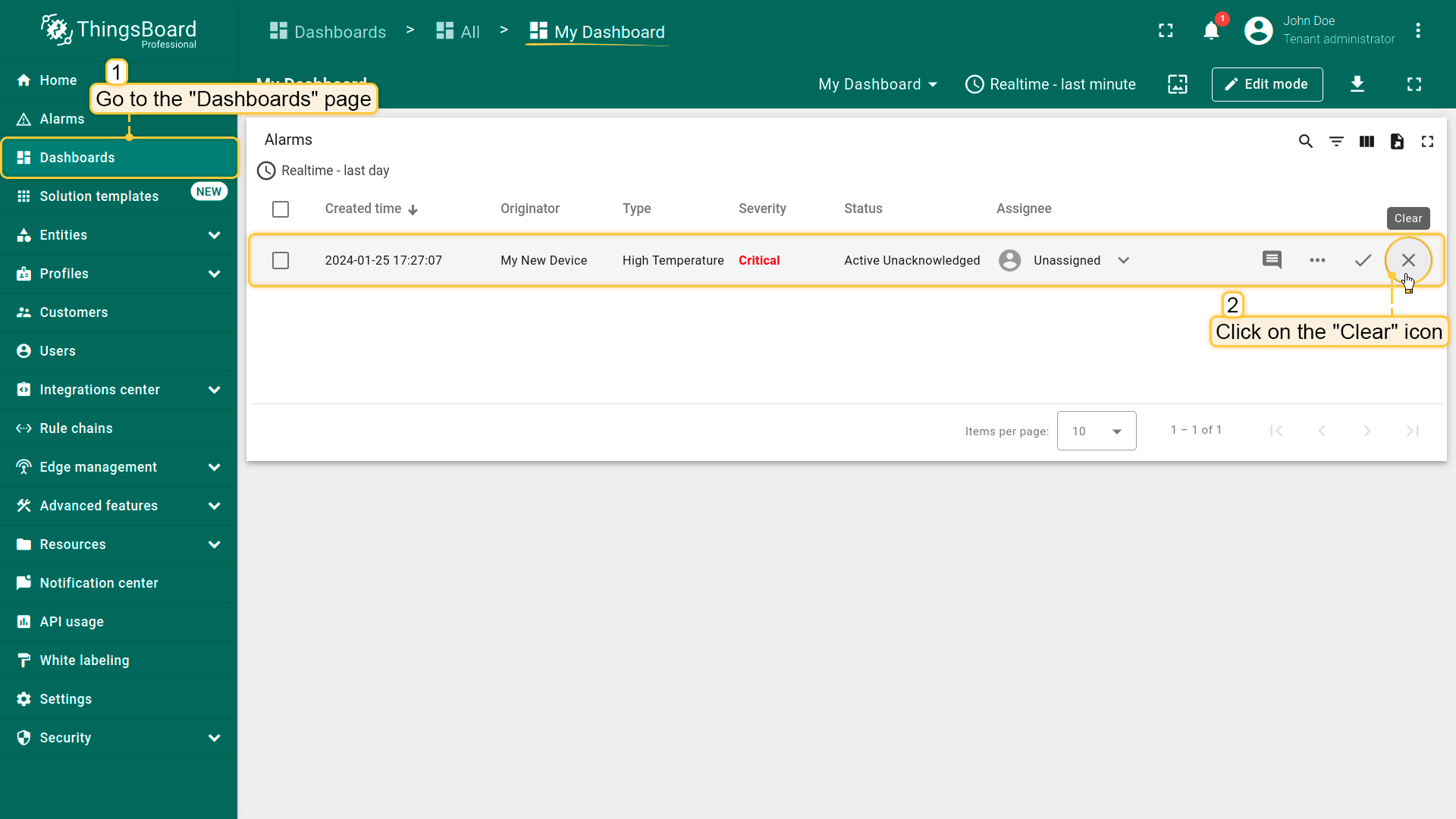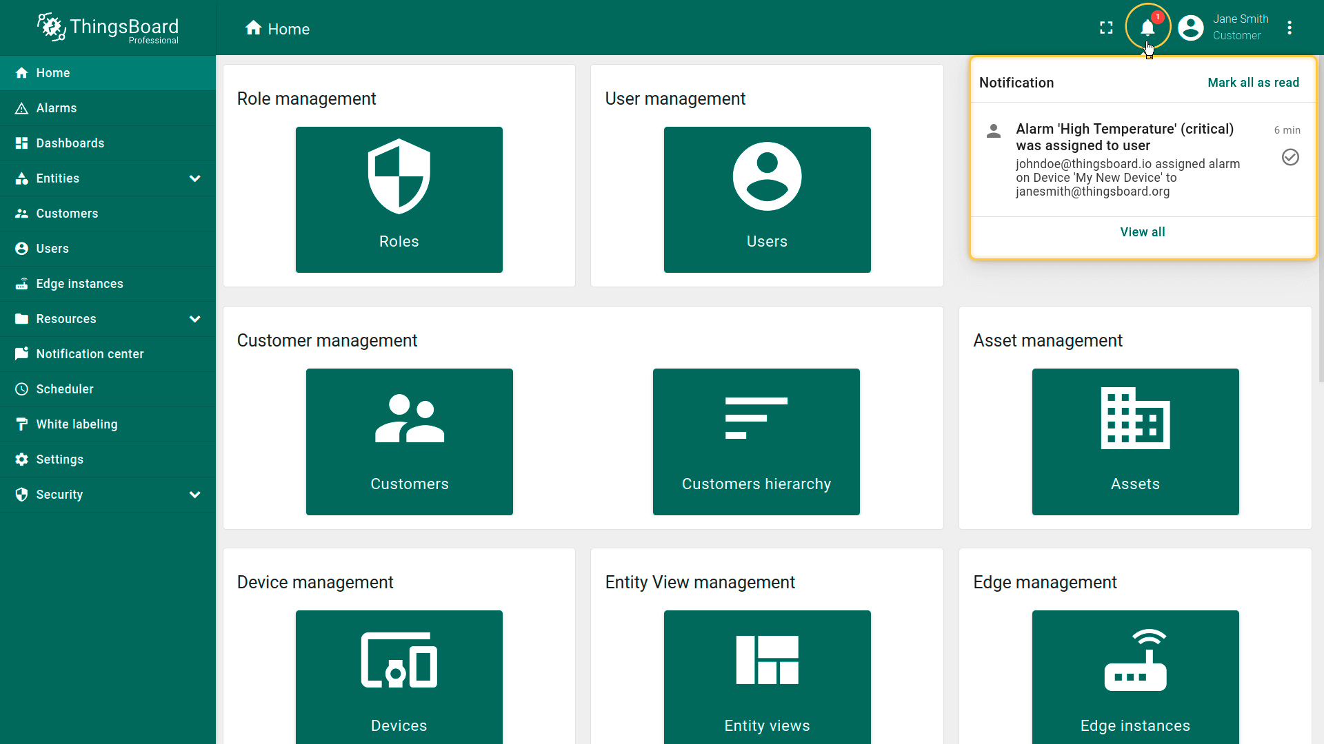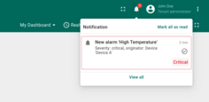 ThingsBoard的通知中心负责向相关用户发送告警事件和系统活动通知。默认情况下,您会接收来自设备的告警,以及客户实体创建的告警(仅对租户管理员)。