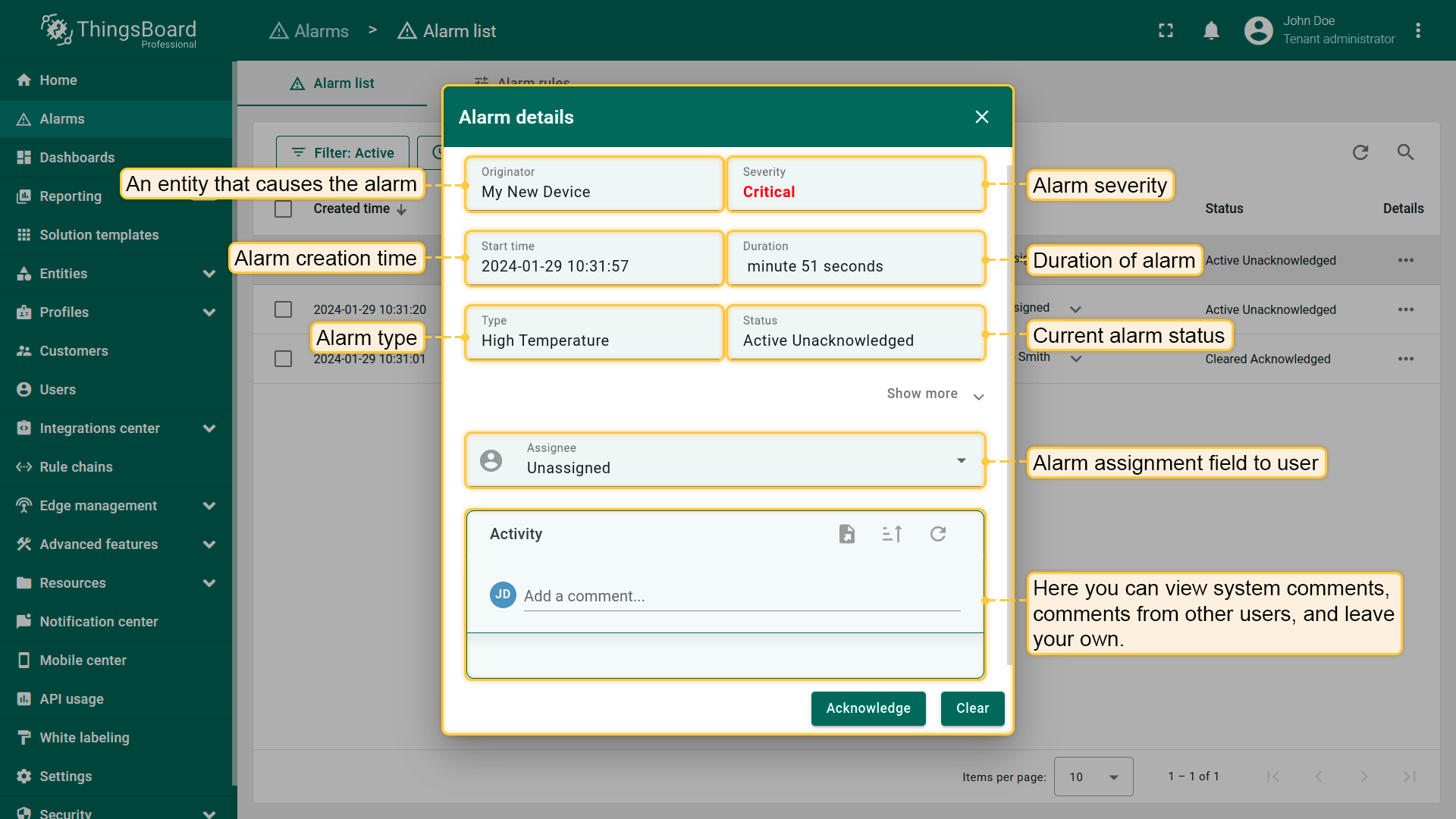 告警是监控与实体(设备、资产、客户等)相关事件的重要工具。告警机制可帮助快速响应异常、条件违规或关键状态变化,预防潜在问题并确保系统稳定运行。