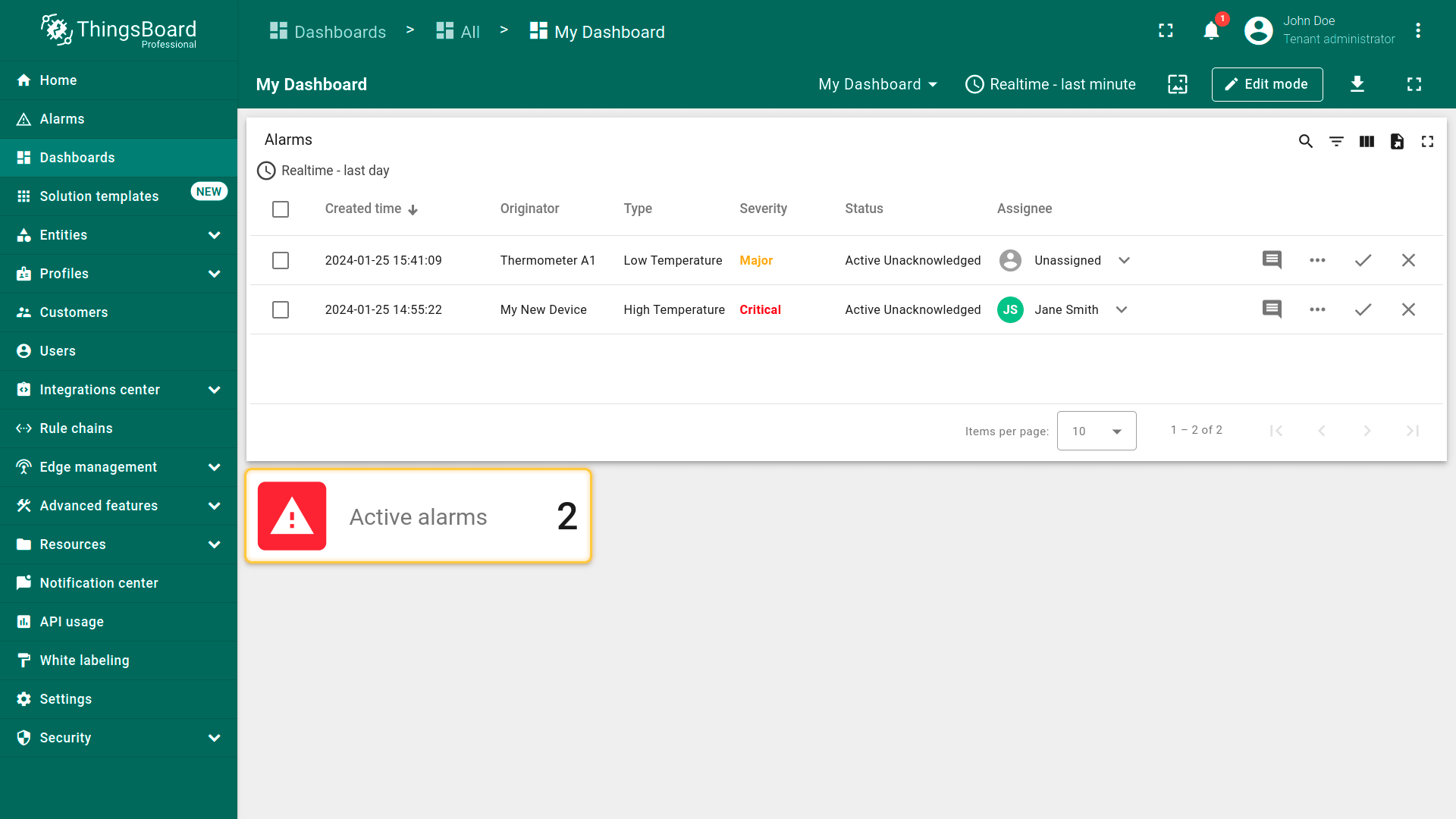 ThingsBoard提供用于在仪表板上展示和管理告警的专用部件: