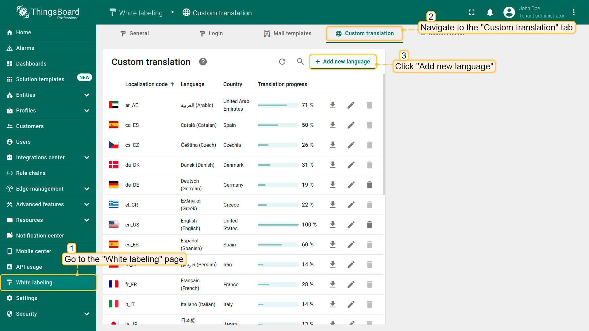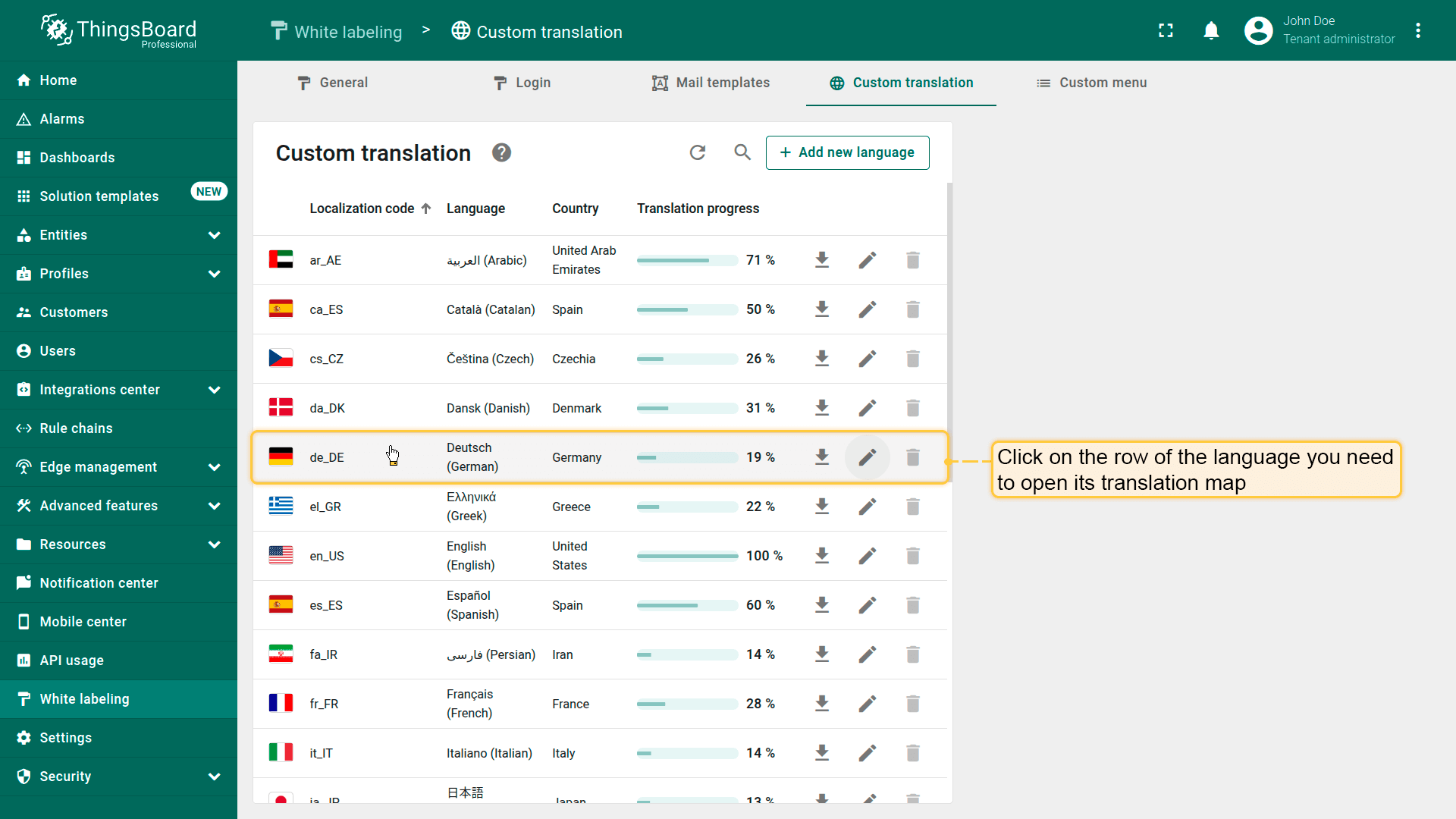 前往“白标”页面并打开“自定义翻译”选项卡。此处可见可用语言列表及以百分比显示的翻译进度。