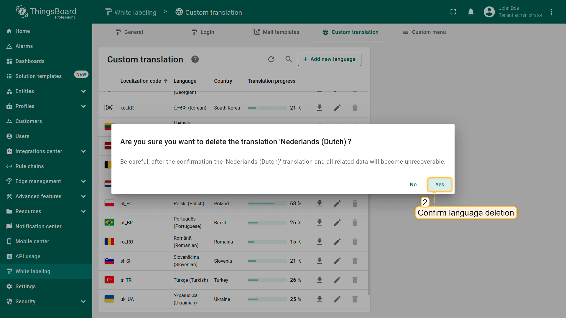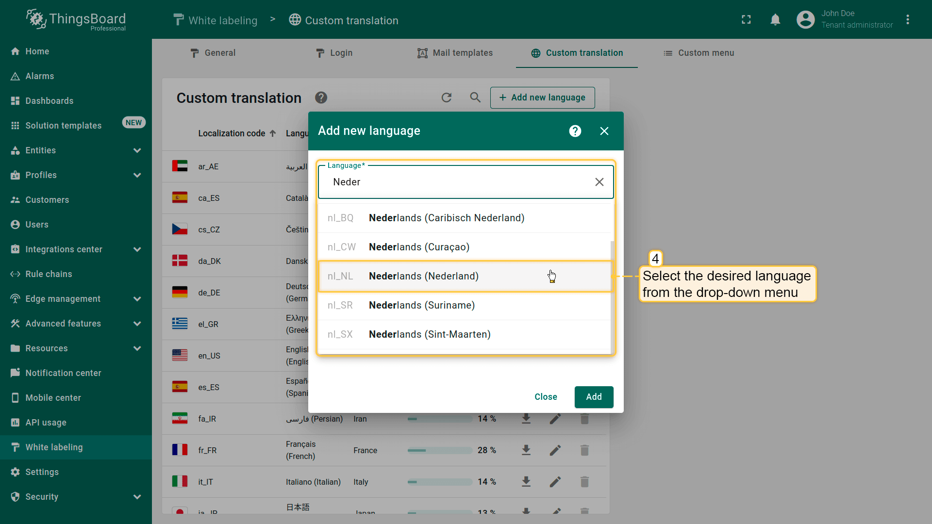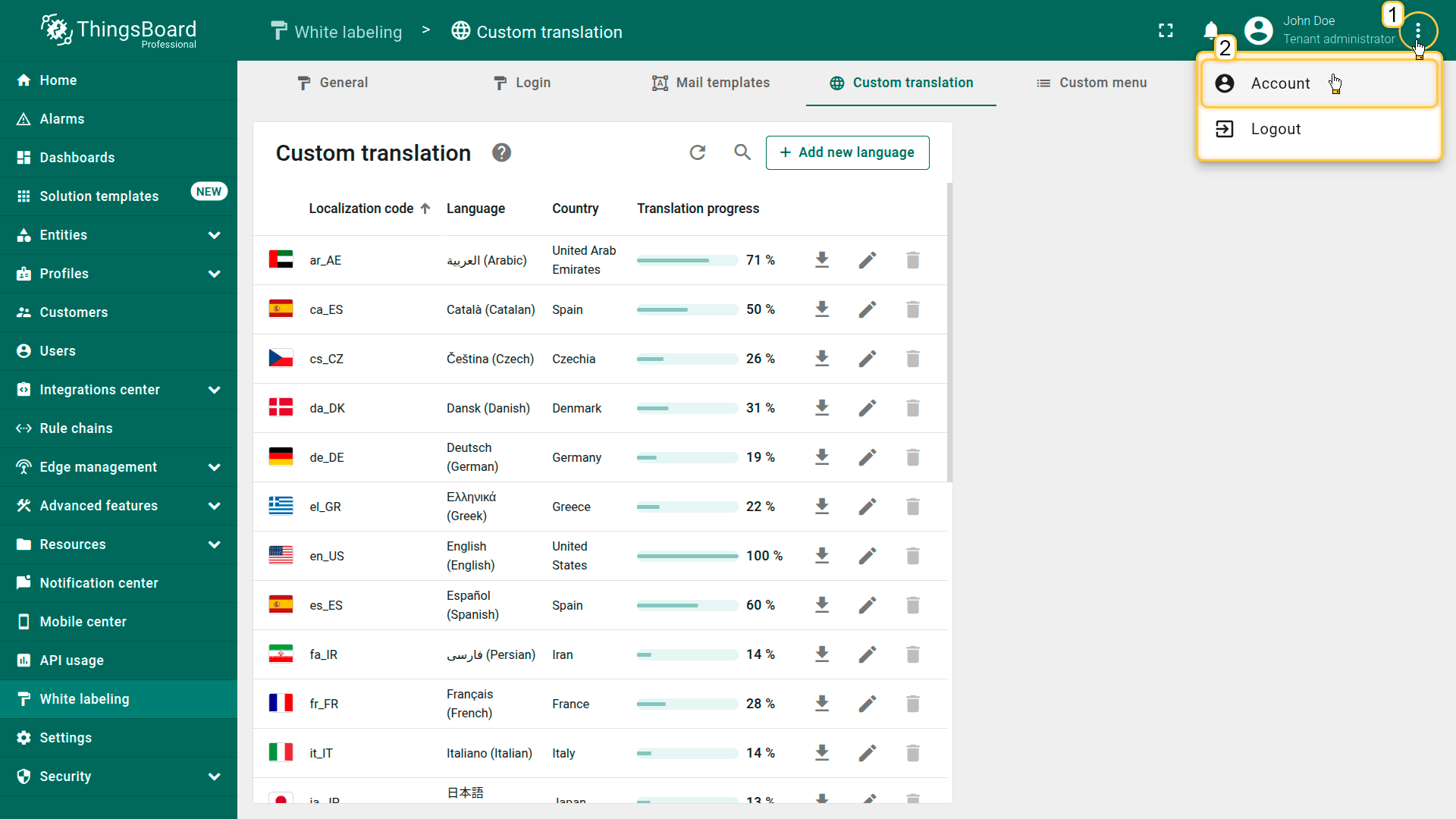 Go to the “Custom translation” tab of the “White labeling” page. Click the “Add new language” button in the upper-right corner.