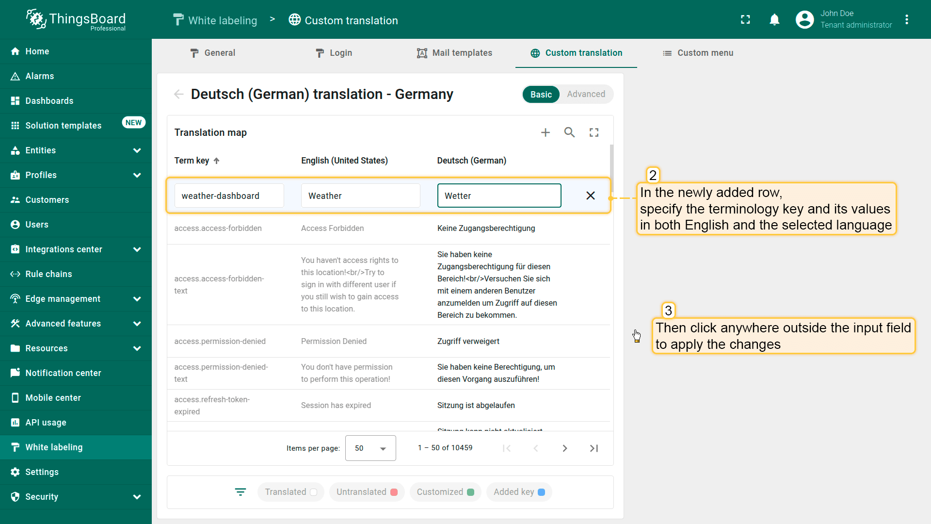 A new row will appear in the table below. Fill in the fields with the appropriate values — enter the key, its English value, and the value for the selected language. Then click anywhere outside the input field to apply the changes.