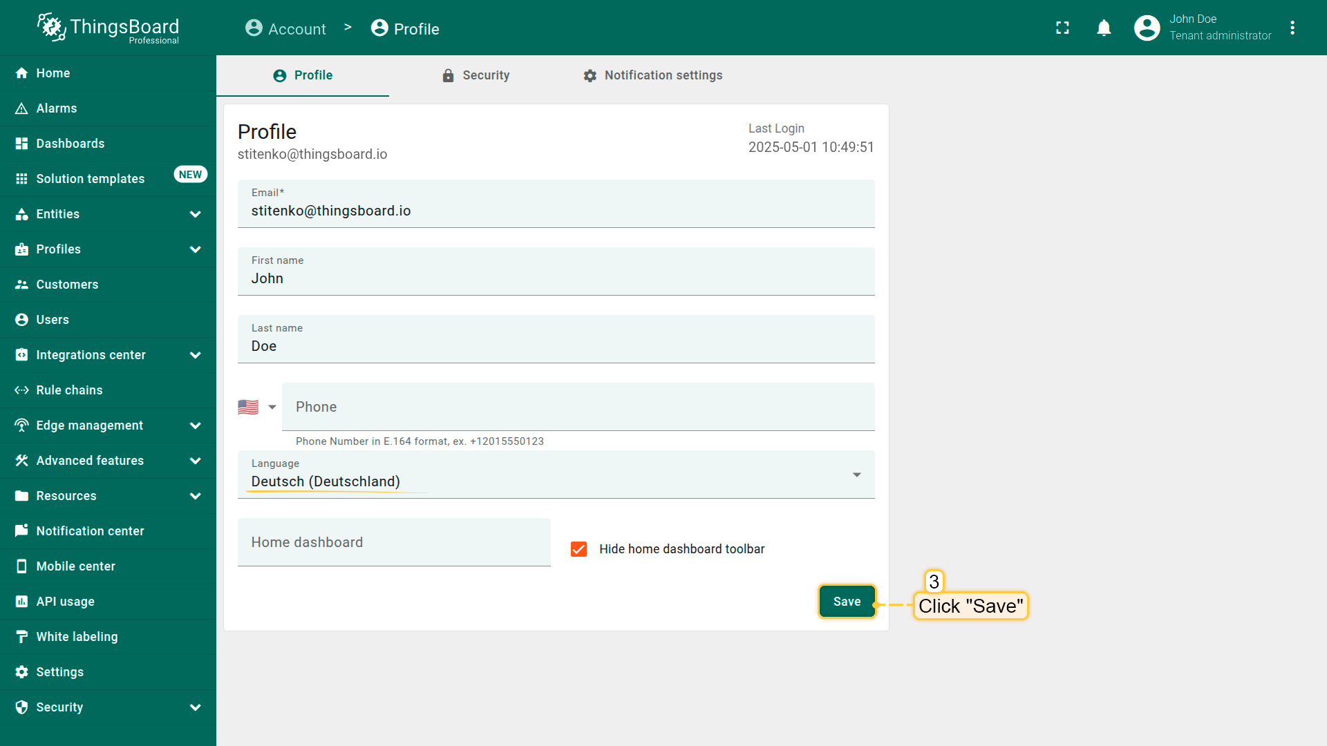After that, the ThingsBoard interface will switch to the selected language.