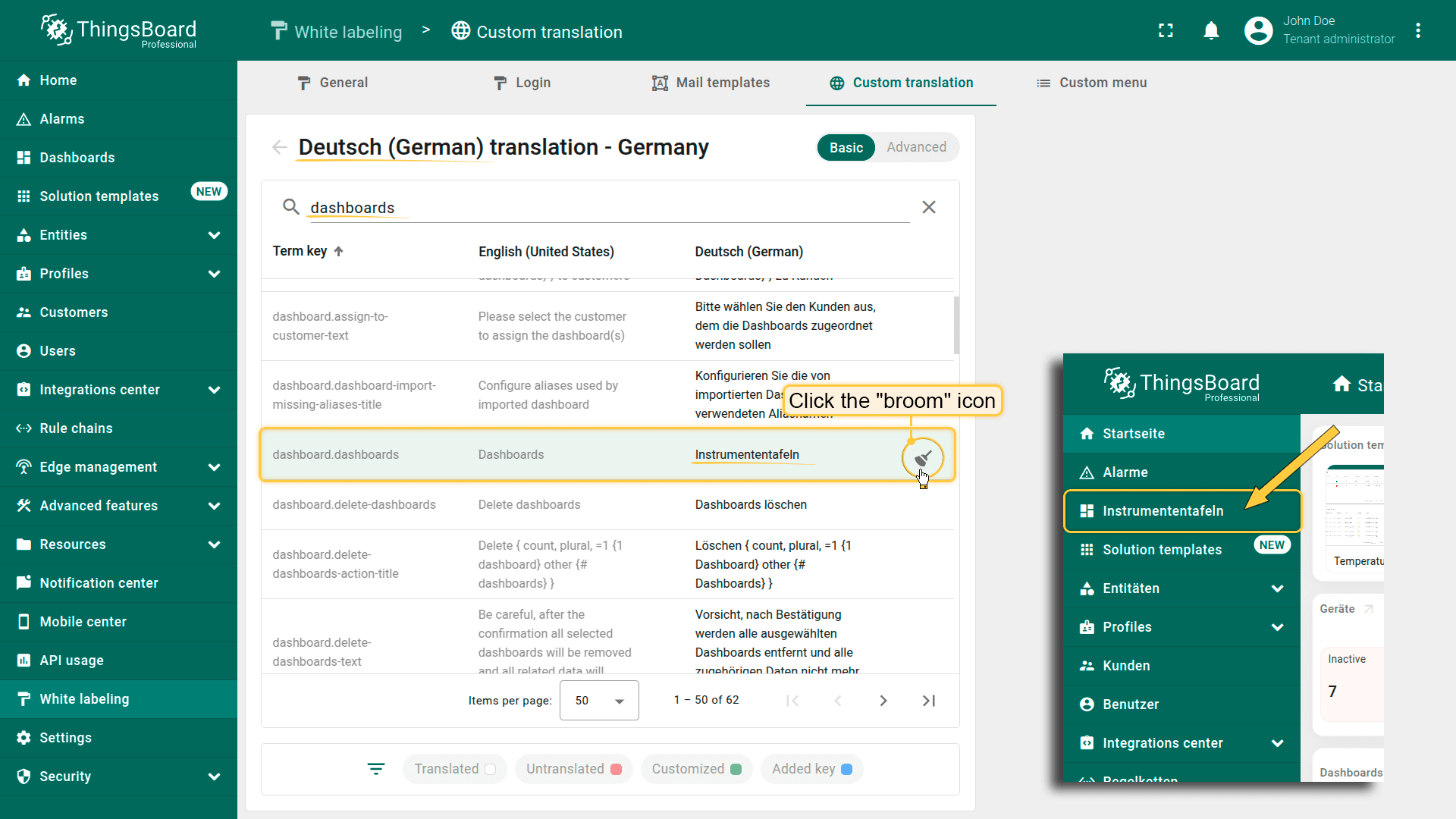 To reset the translation value of a key to the one defined by the system administrator, click the “broom” icon in that key's row.