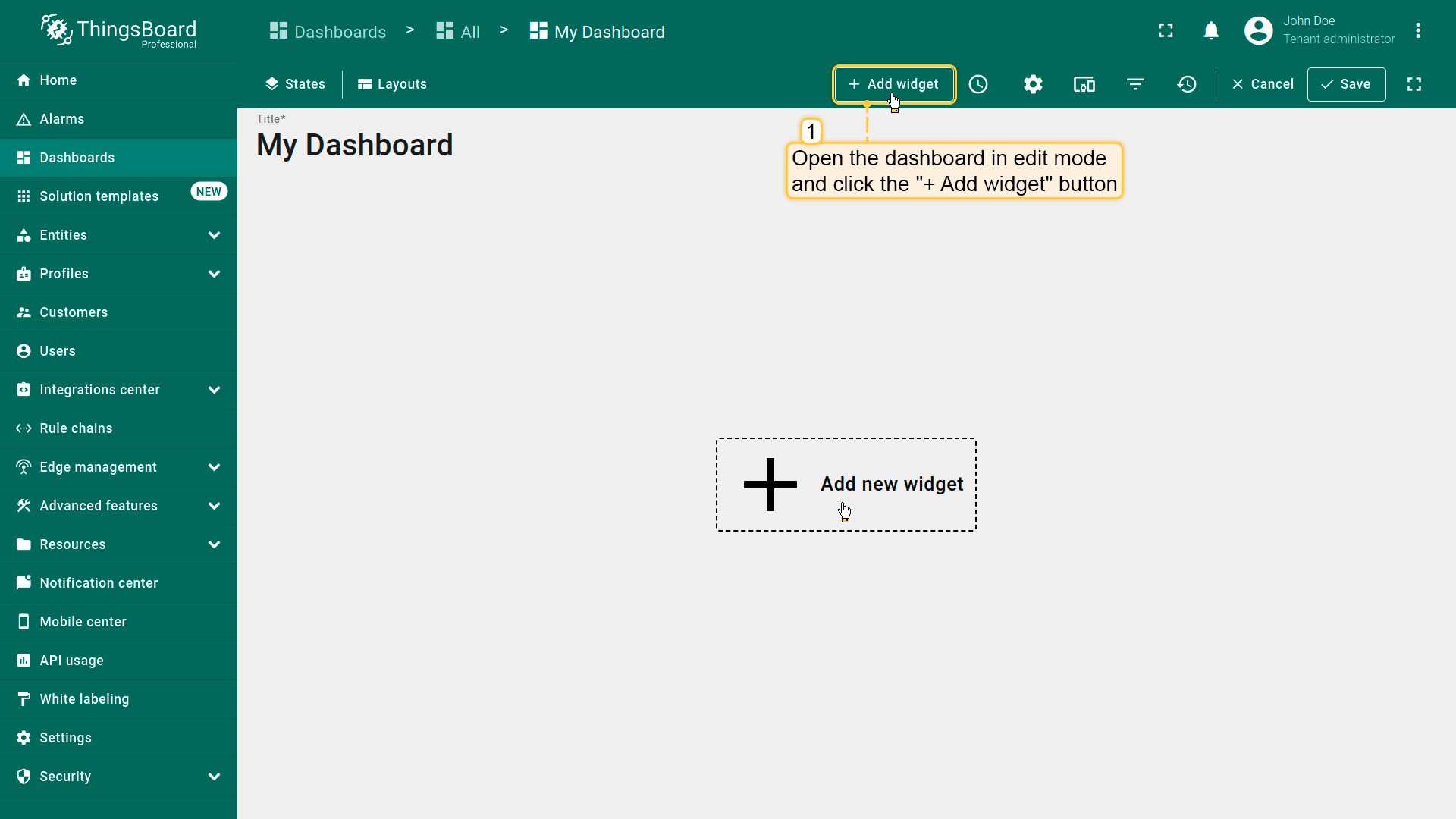 Open the dashboard in edit mode and click the “Add widget” button.