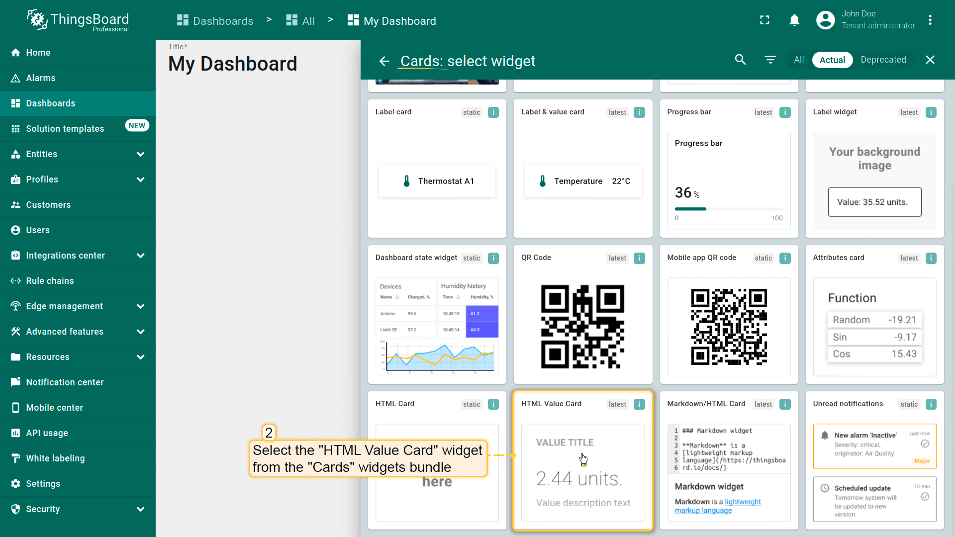 Select the “HTML Value Card” widget from the “Cards” widgets bundle.