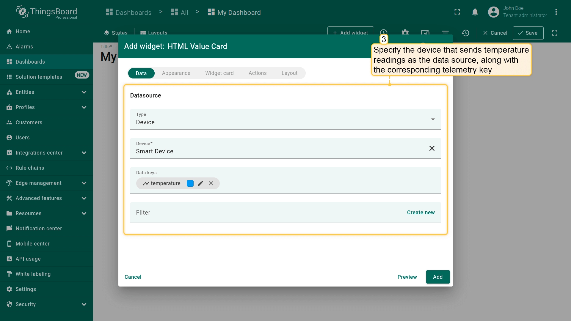 Specify the device that sends temperature readings as the data source, along with the corresponding telemetry key.